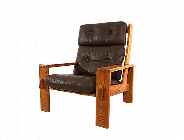 Bonanza armchair by Esko Pajamies for Asko, 1960s. Rare version with high backrest, dark brown leather upholstery and oak structure. It shows almost no signs of wear on the leather, which is thick, soft and supple. The solid oak structure is in excellent condition. It offers excellent seating comfort. Finnish designer Esko Pajamies designed this armchair for Asko Finland in the 1960s, creating a design classic. Finnish furniture manufacturer Asko was founded in 1919 and made a name for itself in the 1960s and 1970s by collaborating with top designers and offering innovative products. Seat height: 39 cm. Seat depth: 52 cm.
