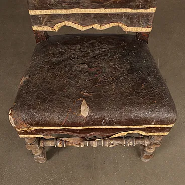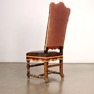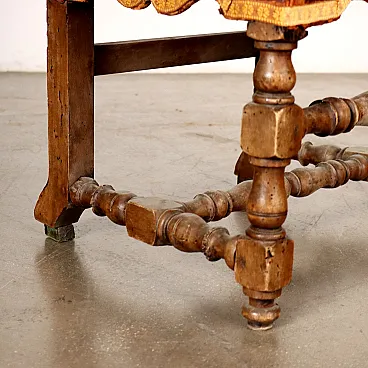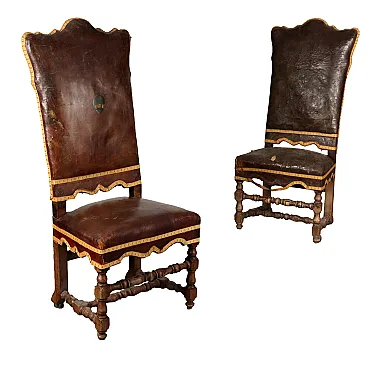 Pair of baroque chairs with shaped backs and padded seats upholstered in leather, Umbria, early 18th century. Walnut structure, crosspieces and spool front legs. A coat of arms is painted in the center of the backrests, which seems to correspond to the coat of arms of the Fedeli family of Spoleto, portraying a dressed faith (in heraldry the faith indicates two hands shaking) with a six-pointed gold star at the top. The leather covering of one seat was replaced in the 19th century.