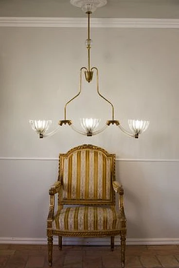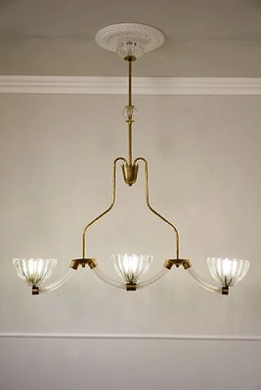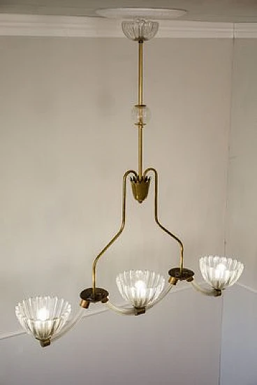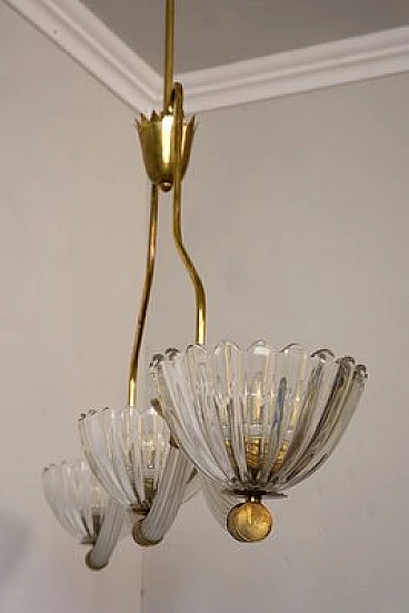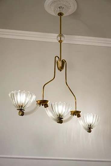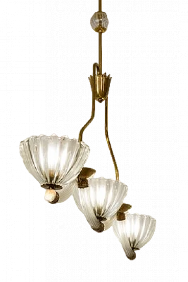 Vintage Murano glass chandelier from the 1940s, attributed to the renowned house of Barovier & Toso. The brass structure supports the three aligned glass cups, distinguished by the fascinating "ribbed" workmanship typical of Murano, which creates a soft and enveloping diffusion of light.