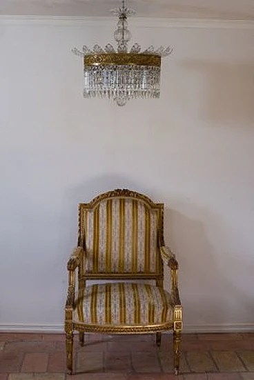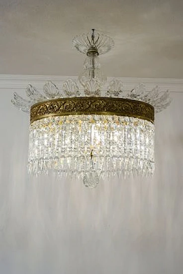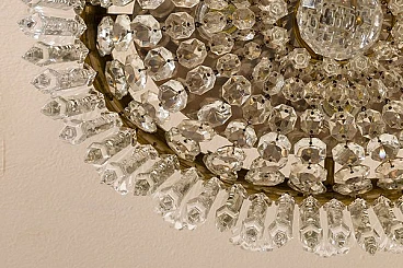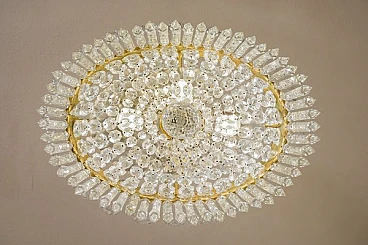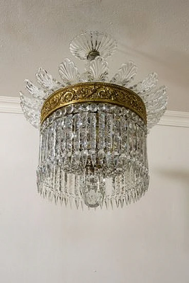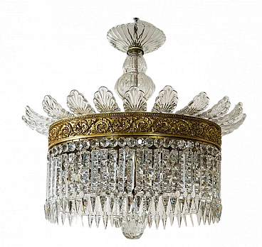 A crystal and chiselled bronze ceiling lamp with an iconic oval balloon shape, enriched by long spears of carved crystal that gracefully encircle the metal crown, creating a glittering frame that envelops the balloon within. The lower part is embellished with a series of arrows dangling around a facetted crystal sphere. The interior lighting, powered by 4 light bulbs, enhances the brightness of the crystals, transforming this ceiling lamp into an authentic French masterpiece of the early 20th century. Completely restored, every single drop has been disassembled, cleaned and sewn up one by one.