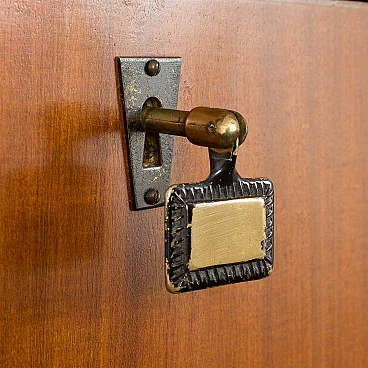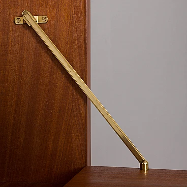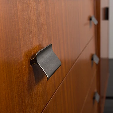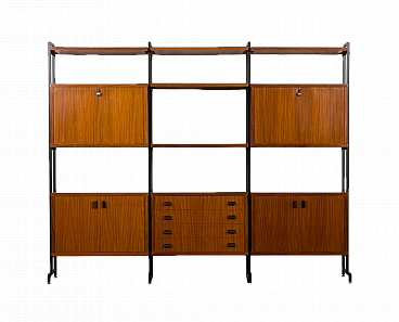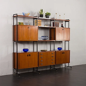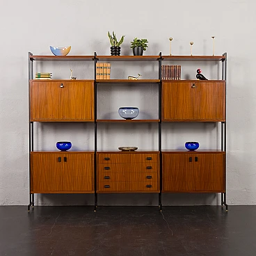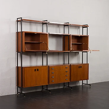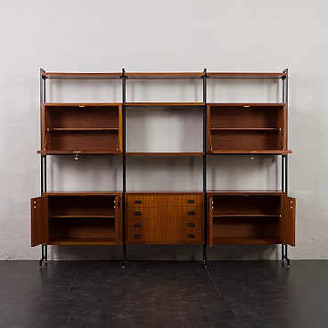 Teak veneered wood and metal bookcase, 1970s. It perfectly embodies the timeless design of the era. Teak wood veneer with rich grain, brass details, creative handle shapes and black painted uprights: all these elements make the construction and design of this piece a perfect match with the aesthetic of Italian bookcases of the 1960s and 70s. Elegant and spacious, the bookcase features four extraordinarily spacious cabinets, two of which can serve as a bar compartment for a sizable collection of spirits and glassware; a chest of drawers with four drawers for organizing smaller items; five deep shelves provide ample space for displaying books, plants and decorations. It is an ideal choice for those looking for a piece of furniture that offers ample storage space while maintaining a sleek and elegant look. This piece of furniture is entirely modular: all shelves and cabinets have the same width and depth and can be moved lower, higher and exchanged according to your needs. All components are mounted on black painted steel uprights with adjustable brass feet. The individually height-adjustable feet ensure stability of the furniture even on uneven floors. The two cabinets are 52 cm high, 80 cm wide and 35 cm deep. The chest of drawers is 52 cm high, 80 cm wide and 35 cm deep; the internal drawers are 10 cm deep. The two bar cabinets are 52 cm high, 80 cm wide and 35 cm deep; depth when fully open: 82cm. The five shelves are 80 cm wide and 35 cm deep. The four metal uprights are 200 cm long each. The furniture has been checked: all mechanisms, mounting systems and drawers work correctly and smoothly. The wood has been treated with professional compounds. Excellent original condition.