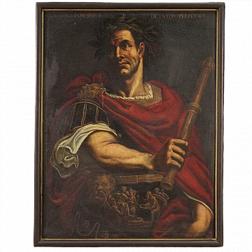 Our painting depicts Julius Caesar with the typical symbols of the victorious general: a magnificently painted laurel wreath, a purple cloak, a scepter and a particular frieze representing Caesar's victory over the Gallic leader Vercingetorix with his beheading. It also has an inscription at the top "Iulius Caes Rom-Imp-I Dictator Perpetws".