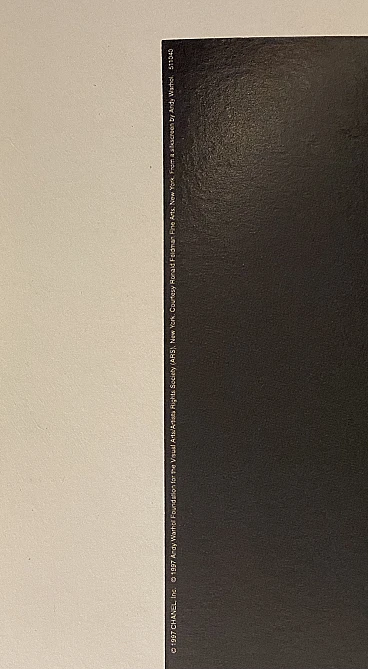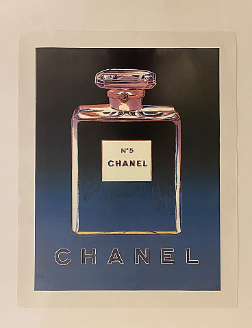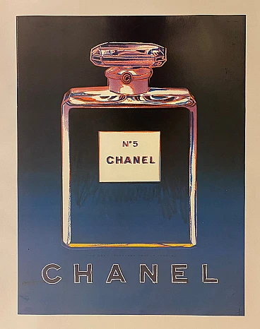 Artist: Andy Warhol. Title: Chanel No. 5: Blue. Original poster printed in offset lithography with linen backing on canvas. Dimensions: 72.5 x 56 cm - in 28.5 x 22. Dimensions with canvas: c.a. 81 x 65 cm - c.a. in 32 x 25,6. Marked upper left " © 1997 Chanel Inc. © 1997 Andy Warhol Foundation for the Visual Arts/Artists Rights Society (ARS), New York". Courtesy Ronald Feldman Fine Arts, New York. From an Andy Warhol 511040 silkscreen print. Signed on the print plate at lower left 'Andy Warhol'. The work is in good overall condition. It has never been framed. Condition A/B. Will be shipped rolled in a sturdy tube by DHL, UPS or FedEx with full insurance and professional packaging.