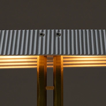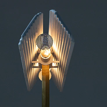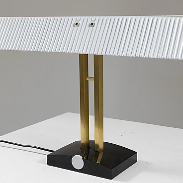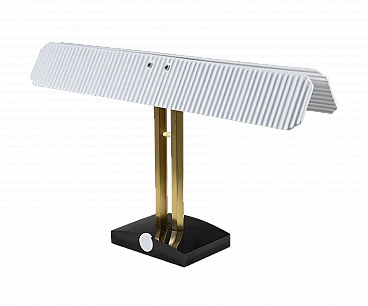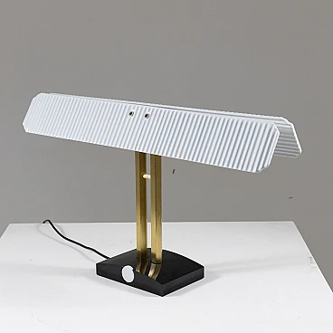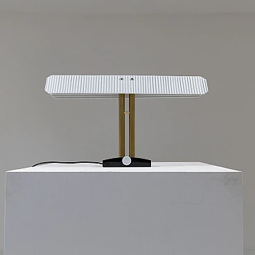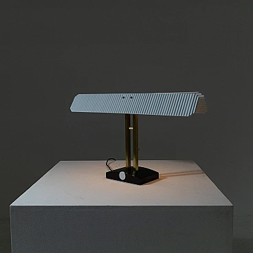 Capalonga table lamp by Tobia Scarpa for Flos, 1980s. Shade composed of two white glazed ceramic plaques on a gilded metal and black painted metal structure.