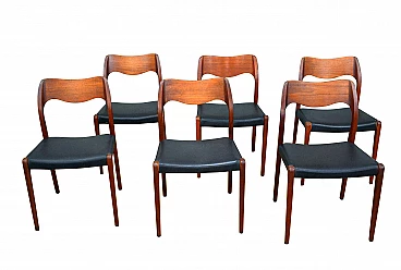 Set of six teak dining chairs mod. 71 designed in the 50s by Niels Otto Moller for J. L. Mollers. The chairs are in excellent condition and are covered in black eco-leather. Small mark on the front of a seat.