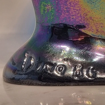 Iridescent ceramic sculpture depicting Virgin Mary seated in prayer. Artist's signature “Dino 86” at the base.