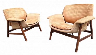 Pair of armchairs by Gianfranco Frattini for Cassina, 1960s. Original label present. Seat height: 45 cm. Wood in patina, upholstery in need to be redone.