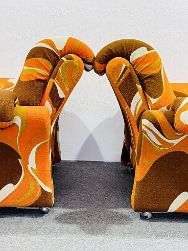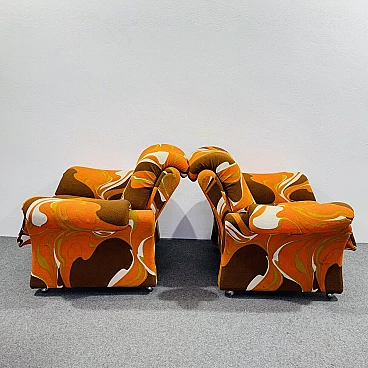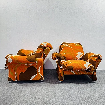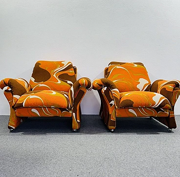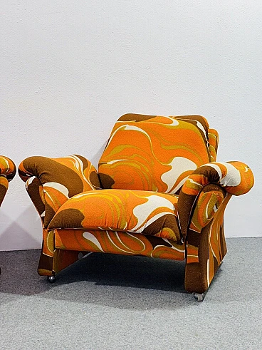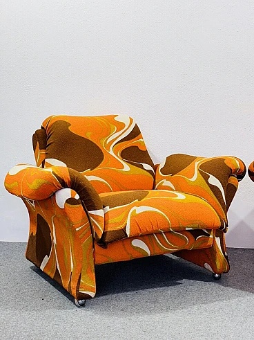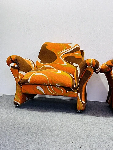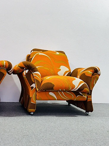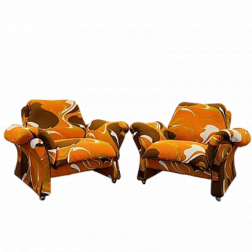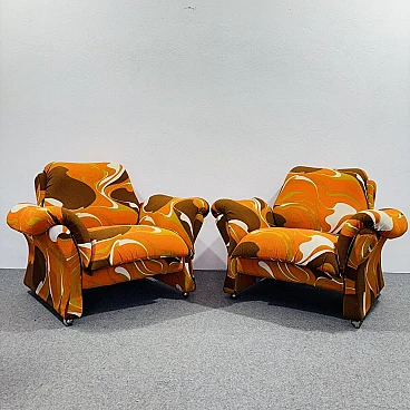 Pair of 1P armchairs model Ionica Space Age, 1970s design. Polyurethane frame, original fabric of the period, orange camouflage. The article is in excellent condition, there are no aesthetic or structural defects to report, only slight and obvious signs of time due to use and age, see photo. Shipping included throughout Italy, write to seller for info.