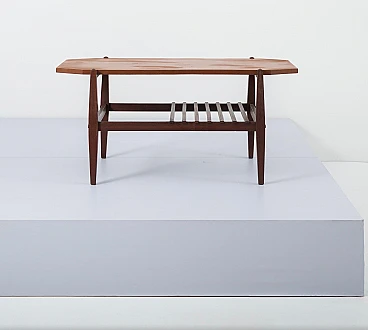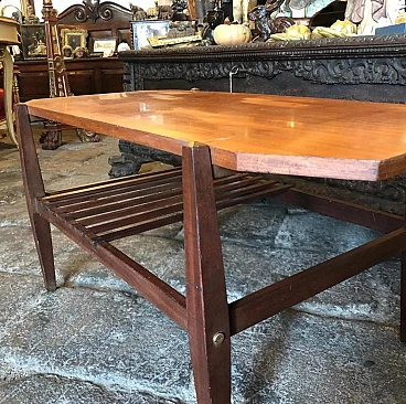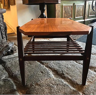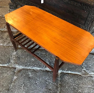 Elegant octagonal teak and mahogany coffee table made in Italy in the 1960s, in very good condition. It features a lovely, clean Scandinavian style. It features clean lines, geometric shapes and a combination of woods commonly used in that era. Mid-century Italian furniture is known for its craftsmanship and elegant design. The top is made of a high-quality wood, prized for its durability and warm, rich tones. The overall design emphasizes simplicity and minimalism, with clean lines and a focus on the natural beauty of the wood. There is also a lower shelf for storing magazines.