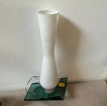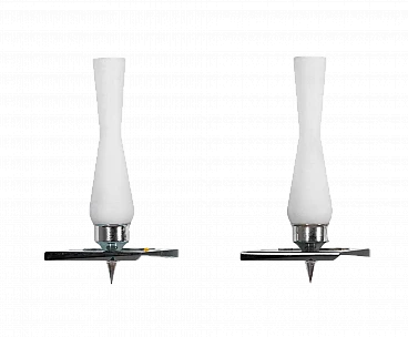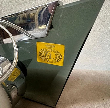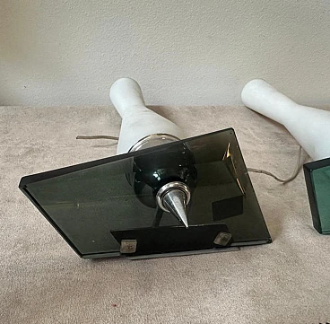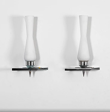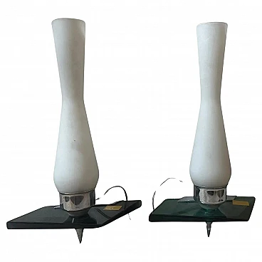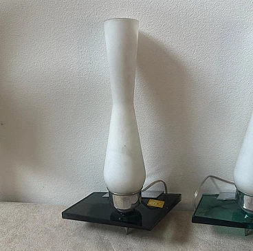 Pair of wall lights in the style of Fontana Arte, 1960s. The chrome-plated steel, heavy glass and white diffuser are in perfect condition. They have an original label on the glass but the original manufacturer could not be traced. The two lamps have heavy glass bases in different colors: one is smoked glass, the other is dark green. They are made of steel and have clean lines and geometric shapes typical of Mid-Century modern design. The glass elements are designed to diffuse and soften the light emitted by the lamps. They are versatile and can be placed in a variety of settings and are designed to add functional lighting and an artistic touch to the environment.
