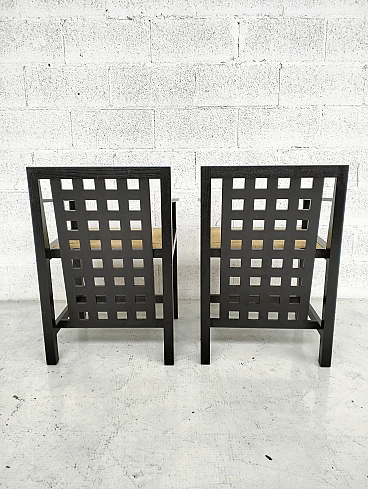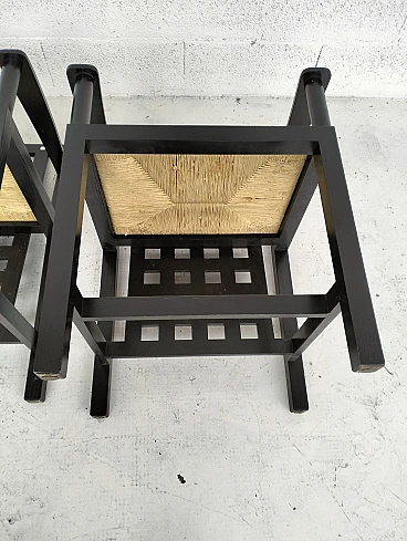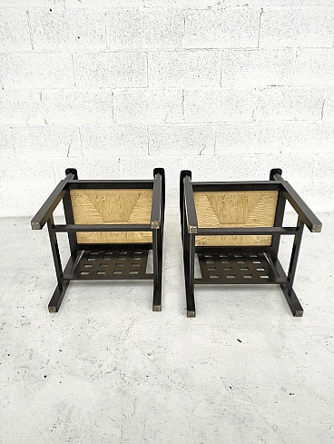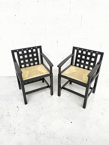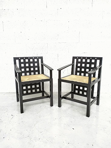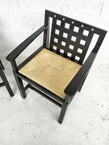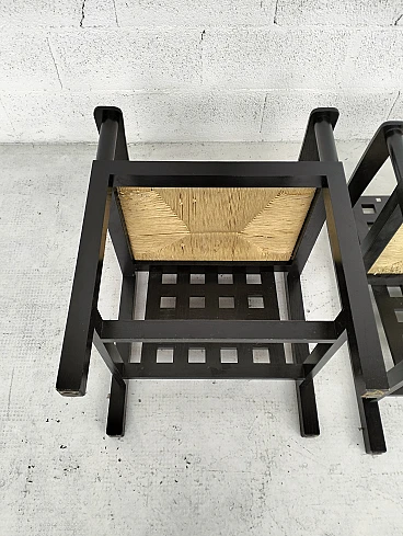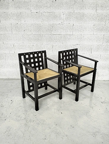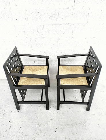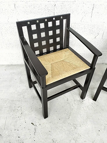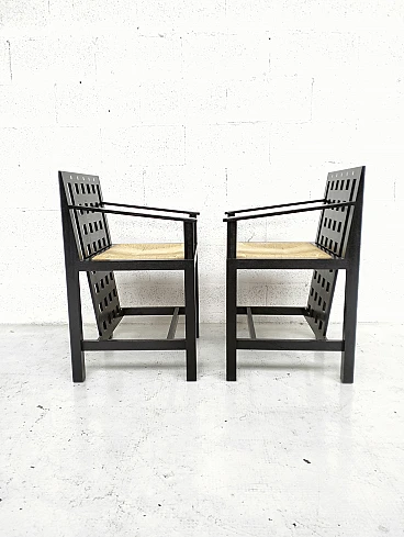 Pair of DS3 model chairs designed by the Scottish architect Charles Rennie Mackintosh in 1918 and produced by Cassina, in the ‘I Maestri’ collection, from 1975. In black open-pore varnished ash, with straw seat and mother-of-pearl inserts. All chairs are marked Cassina and numbered. The chairs are all in excellent condition, with slight signs of use. Charles Rennie Mackintosh (Glasgow, 7 June 1868 - London, 10 December 1928) was a Scottish architect, designer and painter. An exponent of the so-called Glasgow movement, he was the most important exponent of Art Nouveau in the United Kingdom, for some he is considered one of the forerunners of this movement. Cassina Spa is an Italian company operating in the contemporary furniture sector, founded in 1927 in Meda by Cesare and Umberto Cassina. The main activity is woodworking, in-house, for the production of coffee tables. Over the years the company expanded, especially in the post-war period, also thanks to collaborations with external architects who contributed their experience and research. In the 1950s, Cassina moved from handcrafted production to serial production, adopting the logic of industrial design. A change also brought about by the commissioning of furniture for the interiors of large cruise ships.