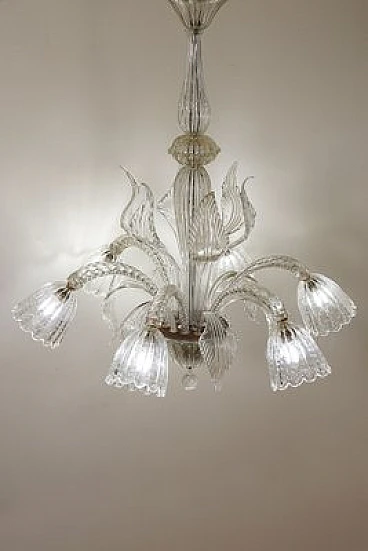 A splendid Barovier & Toso chandelier from the 1940s, an Art Deco work of art of extraordinary beauty. Made using traditional glassblowing techniques, this chandelier is the result of the mastery of Murano glassmakers, giving Murano glass its unmistakable transparency. The particular technique used in its creation makes this chandelier truly unique. The cups and the central structure, including the ceiling cup, have been skilfully worked in 'Bullicante' glass (Venetian slang definition), a distinctive style typical of Barovier chandeliers from the early 1900s. The large bowls are supported by six long arms finely crafted in 'Torchon' (Venetian slang) glass. Twelve leaves, six pointing upwards and six curved downwards, further enrich this beautiful chandelier. Despite its many years of life, this rare chandelier has a timeless contemporary design that makes it perfect for both contemporary and classic settings.