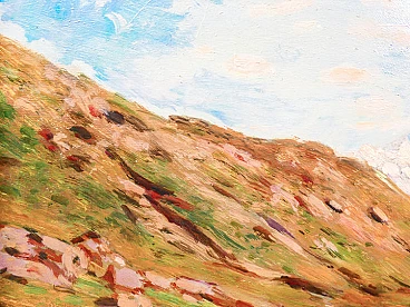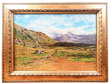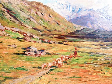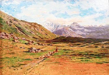 Oil painting on panel by Eugenio Gignous depicting a view of Mount Fletschhorn with the Simplon Pass and a flock, late 19th century. Signed. Eugenio Gignous (1850-1906) was an Italian painter known for his contribution to Lombard naturalism. Trained at the Brera Academy of Fine Arts, he was influenced by the Milanese Scapigliatura and by his friendship with artists such as Tranquillo Cremona. Specializing in landscapes, Gignous adopted plein air painting techniques, obtaining recognition in national exhibitions. From 1887 he lived in Stresa, painting views of Lake Maggiore and the surrounding mountains. His works reflect an intense chromatic and luministic research, revealing an acute sensitivity for the natural and rural landscape. Size without frame: 48 x 70 cm.