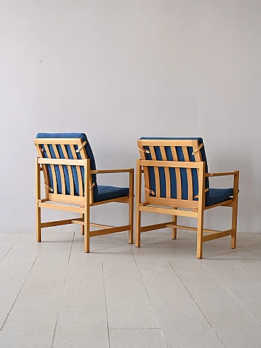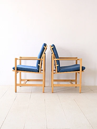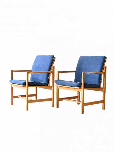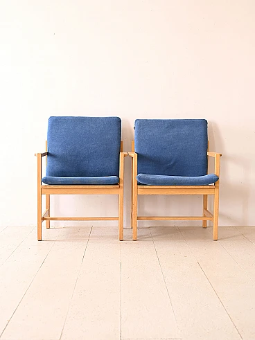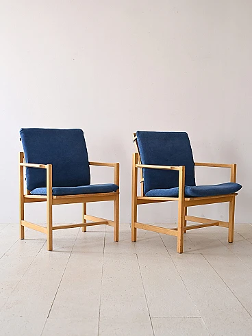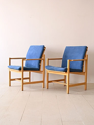 Set of two vintage armchairs in Scandinavian design. An authentic expression of the timeless aesthetics and craftsmanship of one of the 20th century's greatest designers. These armchairs, signed Børge Mogensen, embody the distinctive elegance and simplicity of the Nordic style. The light oak frame, skilfully crafted, is a testimony to the great attention to detail. The seat and back cushions are upholstered and covered in a blue fabric. With Børge Mogensen's signature, these armchairs become true pieces of art, destined to become the centrepiece of your living space. Ideal either for creating a relaxing corner in the living room or for adding a touch of vintage elegance to the bedroom, these armchairs are an investment in taste and quality that will last. Good condition, conservative restoration with natural products has been carried out. It may show some signs of time. Please pay attention to the photographs.