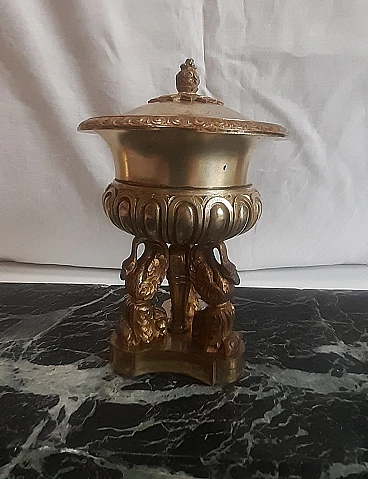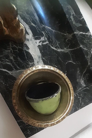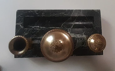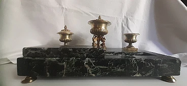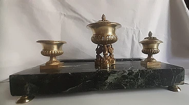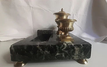 Inkwell made of elegant Italian marble with a distinctive dark green color and gilded brass from the second half of the 1800s. “Verde Alpi” or also Verde Saint Denis marble has been valued and used as a valuable material since Roman times. The area of origin of this natural stone is the Aosta Valley, specifically the western Italian Alps. Italian marble with a characteristic dark green color enriched by veins tending to white. The irregularly distributed veined texture is the main characteristic of this marble and gives the material an elegant and distinctive appearance.