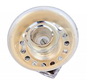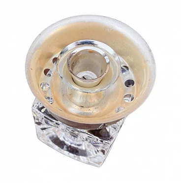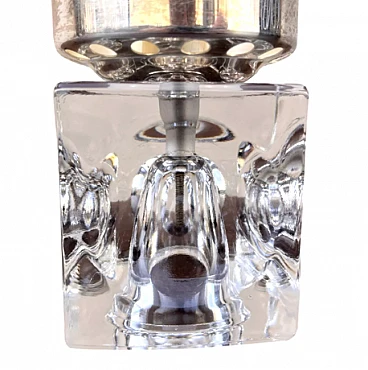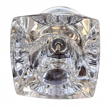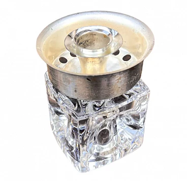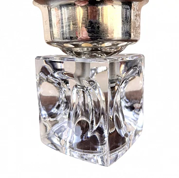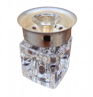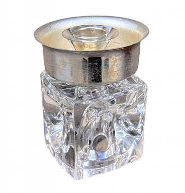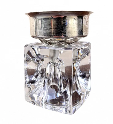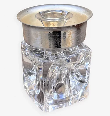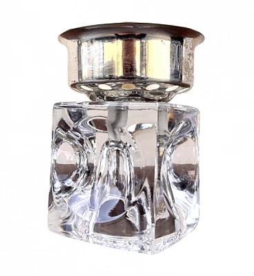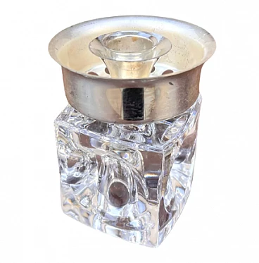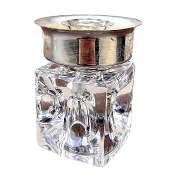 Glass and silver-plated metal candlestick by Peill & Putzler (Germany), 1970s. Boho (Czech) glass, made by the Rudolfova Hut glassworks (later part of Sklo Union), designed by Rudolf Jurnik. The heavy square block of solid glass (750g) has circular bowl-shaped indentations on each side which create beautiful lighting effects. It is in very good condition, showing only minor traces of use and the passage of time in the form of small scratches and patina. The base of the candlestick is made of pressed crystal glass. It has no damage or mechanical defects. Discolorations in photos result from poor lighting of the object and are much less visible in reality.