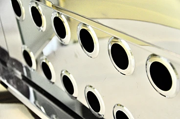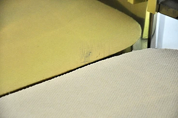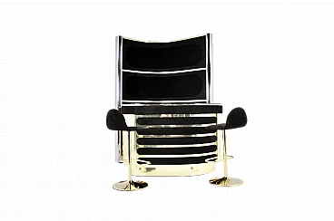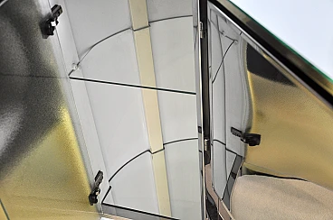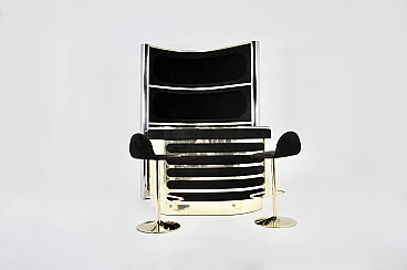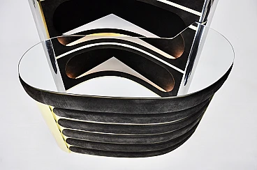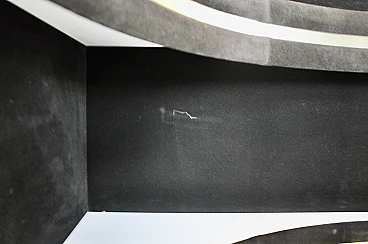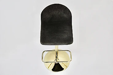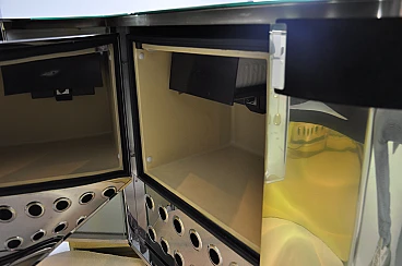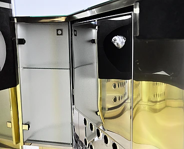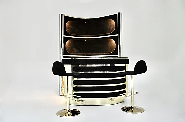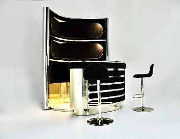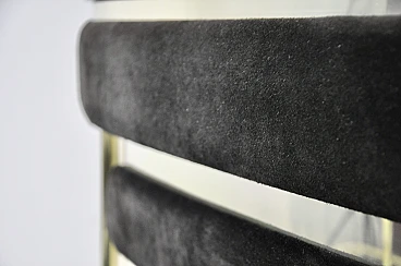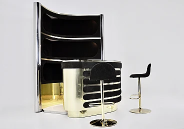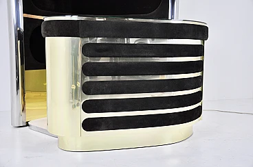The set includes a cabinet with three illuminated shelves made of black suede, chrome-plated metal and brass, one of the sides at the back is mirrored glass. It also includes a suede and brass shelf with mirrored glass top, a refrigerator and a glass cabinet with shelf. The floor is carpeted. Pair of suede and brass stools. Stool dimensions: H 82 cm, W: 35 cm, D: 36 cm, seat height: 62 cm. Shelf dimensions: H: 193 cm, W: 148 cm D: 121 cm. Counter dimensions: H: 88 cm, W: 133 cm, D: 52 cm.