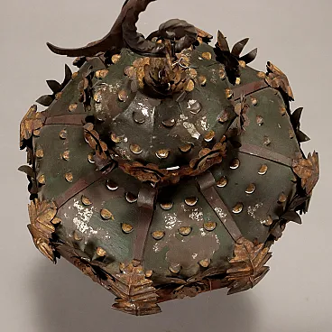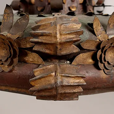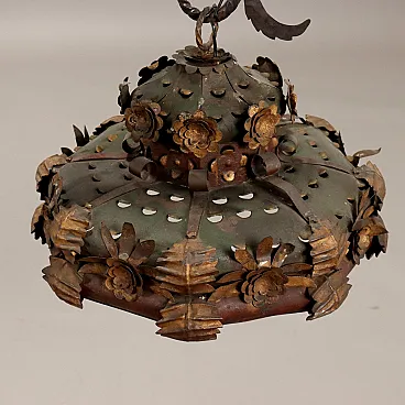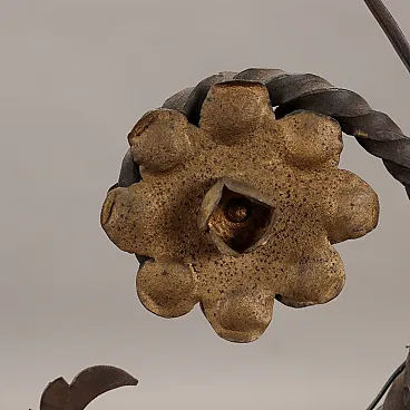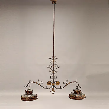 Two-arm wrought iron and sheet metal chandelier, late 19th century. Richly embellished with gilt floral elements and lacquered bells.