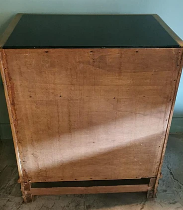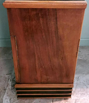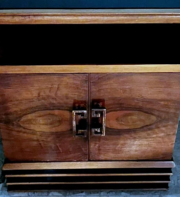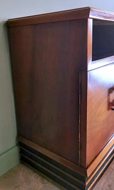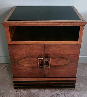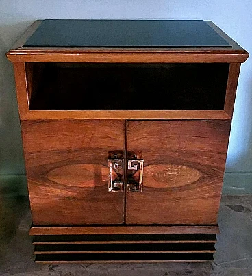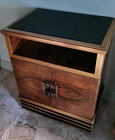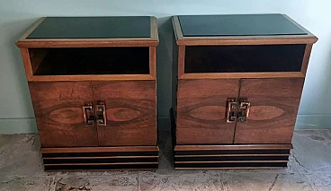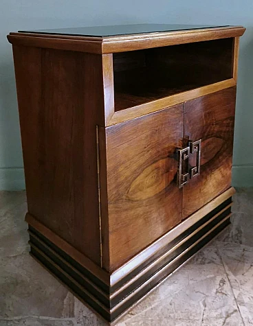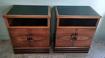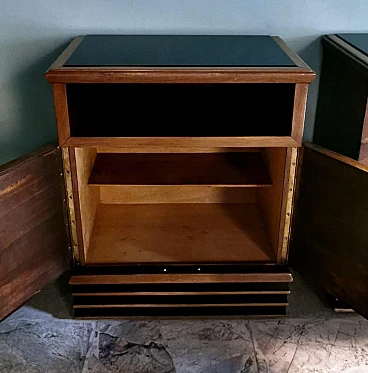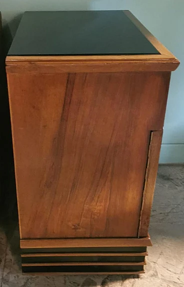 We advise you to read the entire description, as we try to provide you with detailed technical and historical information to guarantee the authenticity of our objects. A particular and interesting pair of Italian bedside tables in walnut; on each bedside table, an elegant black glass is housed on the upper shelf; the space underneath is efficient and functional; the large lower compartment is closed by two doors, and inside it is divided by a useful shelf; very elegant is the workmanship under the doors, which serves as a base for the bedside table; the doors themselves have been cleverly hinged on the side of the bedside table. The handles, in burnished brass, are not from the period but were replaced at a later date. The bedside tables were created between 1930 and 1935 in a craft workshop in Cantù, a town in the province of Como in Lombardy (Italy), renowned for its tradition in the production of luxury furniture and long regarded as an important centre for furniture craftsmanship with a reputation established over the years for the creation of high-quality pieces. The Cantù companies have always supplied furniture for a high-end clientele, which included both private individuals and luxury furnishing projects for hotels, restaurants and prestigious residences all over the world. The bedside tables were made from normal walnut wood, then an unusually strong and robust veneer was made from a superior quality of walnut, the best part of the 'Juglans regia' wood called 'national walnut' or 'European walnut' was used. Walnut (Juglans regia) is a valuable and expensive hardwood; its colours, flaming and grain have been appreciated for centuries. It is a wood with an incomparable aesthetic appearance. Walnut furniture is highly sought after but also expensive because the proportion of usable wood in each plant is very small. Veneering is an ancient woodworking technique that involves the application of a thinner layer of precious wood on a substrate of normal quality walnut wood; the precious walnut wood is harvested from trees cultivated specifically for this purpose, then it is cut into thin sheets whose thickness varies from 1 to 2 millimetres, in the case of our nightstands this thickness is greater; the base wood is prepared by applying a special glue, then the fine walnut sheets are applied manually and evenly; after this process, the whole is pressed and left to dry, allowing the glue to adhere firmly between the fine walnut wood and the substrate, creating a stable veneer; this, once dry, is finished by sanding, polishing and the application of protective finishes, such as varnish or oil, to improve the appearance and durability of the wood. The history of veneering dates back many centuries; it is believed that it was first used in ancient Egypt and China. Over the centuries, this technique has spread throughout the world and has continued to evolve, becoming an important part of the production of high-quality furniture, luxury goods and Objet d'art. This ancient technique, applied to our bedside tables, has made it possible to enhance the colours, flaming and grain of the precious flamed walnut. Our craftsmen have completely restored the wooden structure by hand and the items are in excellent condition. Width 57 cm, depth 37 cm, height 68 cm. For all our shipments we use special packaging materials (wooden crates, polystyrene, etc.) to ensure maximum protection and safety of the objects.