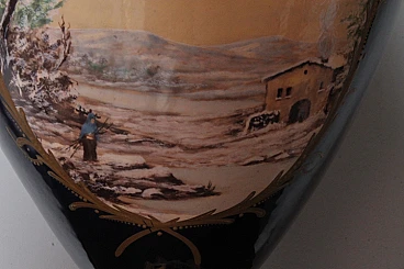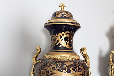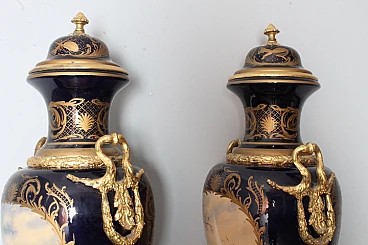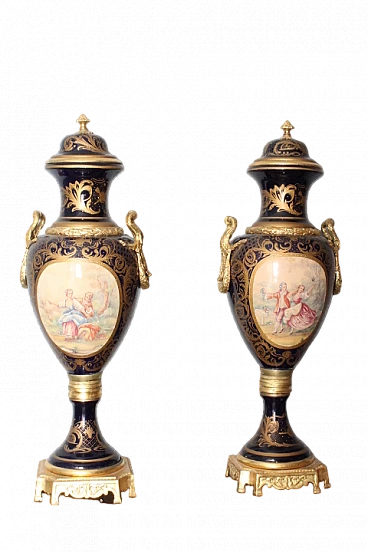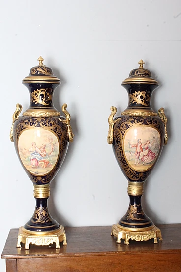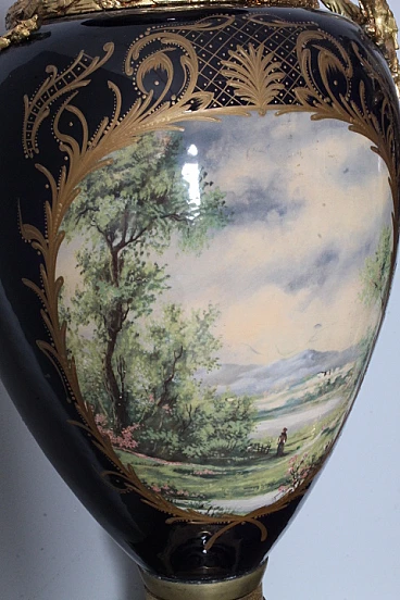Antique, huge, museum porcelain Sevres vases with bronze bases, 20th century. They depict landscapes on one side and gallant scenes on the other. Finished in gold. No marks. Height 106 cm. Excellent state of preservation. From an important family, of great quality and effect.