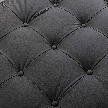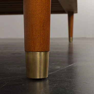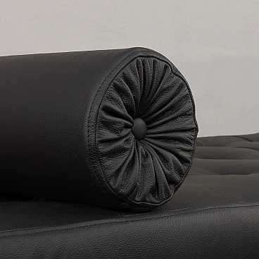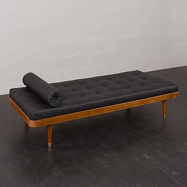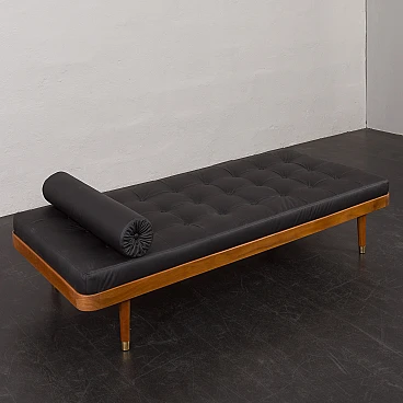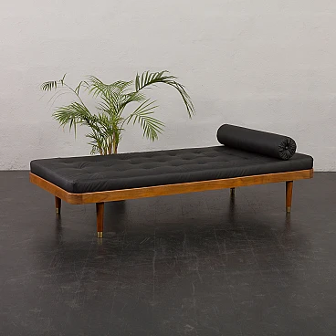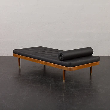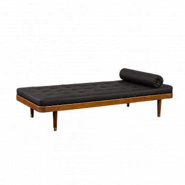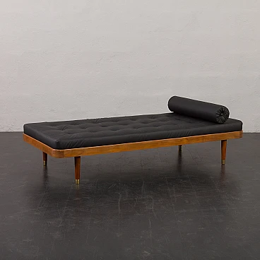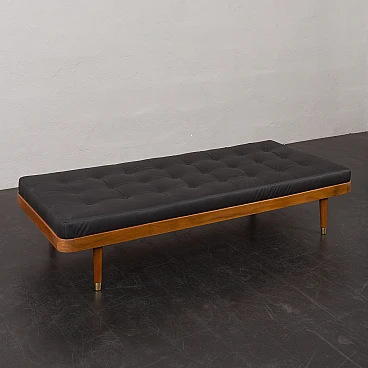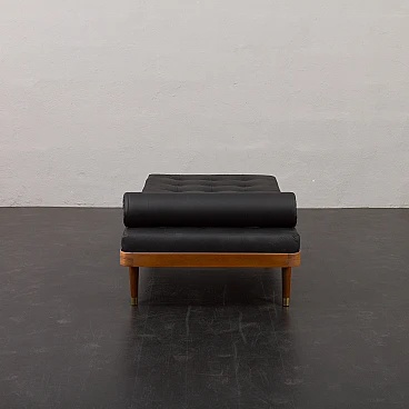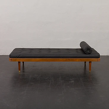 Teak and black leather daybed most likely made by Horsens Møbelfabrik (Denmark), 1960s. It embodies the essence of mid-century design with its proper proportions and functionality. The wooden structure, made of teak, together with the new black aniline leather covering, make this daybed elegant and comfortable. It showcases excellent craftsmanship, with appropriately selected teak wood that matches all parts and includes brass details. The furniture features a black leather upholstered quilted mattress with new padding inside, a decorative cushion and brass feet, which add an elegant touch to the piece. The daybed is in fantastic condition after restoration; special care has been taken to ensure the finish and authenticity of this vintage piece. The teak wood structure has been cleaned and treated with protective oil to enhance its grain. New covering and padding provide comfort and durability. The legs are detachable for convenient storage or transport. The cushion is 80 cm wide and has a diameter of 13.5 cm. Height from the ground: 24 cm.