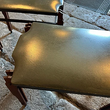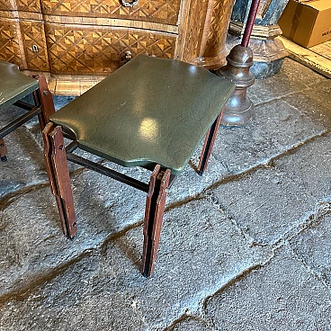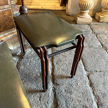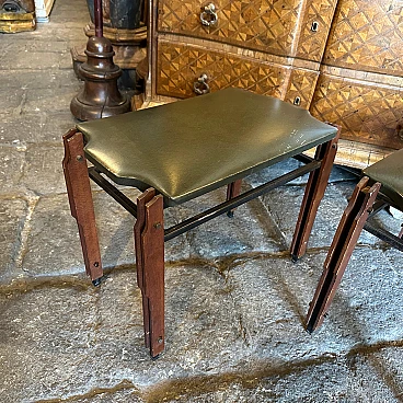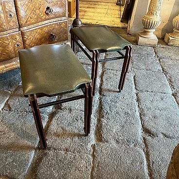This pair of Mid-Century Modern stools from the 1960s, inspired by the style of Ico Parisi, encapsulates the essence of elegant design and timeless elegance. Made in mid-20th century Italy, these low stools feature a harmonious blend of wood and faux leather upholstery in a sophisticated shade of green. The use of teak or other material lends warmth and organic texture to the stools, while the faux leather upholstery adds a touch of luxury and visual interest. The stools' clean lines and minimalist silhouette reflect the influence of Ico Parisi, an iconic Italian design figure known for his modernist aesthetic and innovative approach to furniture design. The rich green hue of the faux leather upholstery adds a splash of colour to the stools, infusing them with a sense of vibrancy and personality. The faux leather material, while evoking the luxurious look of exotic leather, offers a cruelty-free alternative that aligns with the ethos of mid-century modern design. Compact and versatile, these low stools are perfect for use as occasional seating in a living room, bedroom or entryway, adding a touch of retro charm to any space. they are in good original condition.