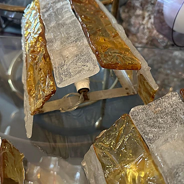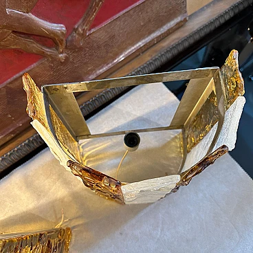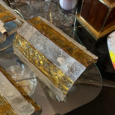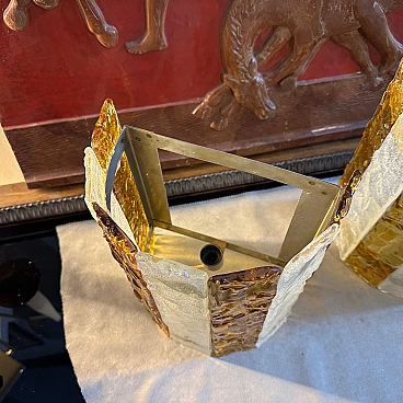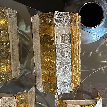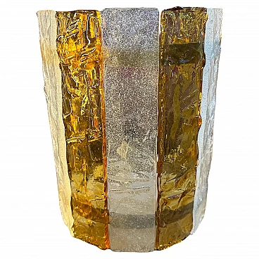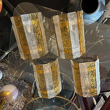 Four Murano glass wall sconces designed and produced in Italy by Mazzega Murano, working and in good original condition. These beautiful wall sconces capture the essence of 1970s Mid-Century Modern design, made with exquisite yellow and white stripes of Murano glass. These wall sconces are a perfect blend of form, function and art, adding a touch of vintage elegance to any space. The Murano glass gives off a soft, diffused light when illuminated. The glass is masterfully hand-blown, showcasing Mazzega's unparalleled expertise in glassmaking. Its irregular surface is composed of alternating stripes of white and yellow, reminiscent of the vibrant colour palettes of the era. The clean lines and minimalist silhouette of the wall sconces reflect the Mid-Century Modern aesthetic, embodying a sense of simplicity and elegance that remains timeless. When lit, wall sconces cast a soft, inviting light, creating a cosy ambience and accentuating the beauty of the surroundings. Used as accent lighting or as the focal point of a room, these Murano glass wall sconces by Mazzega elevate any interior with their exquisite workmanship and characteristic retro charm. The four wall lights are sold individually, price per piece.