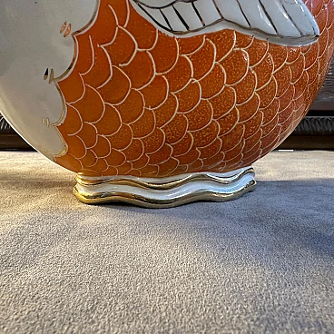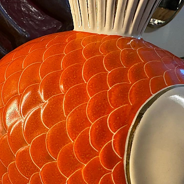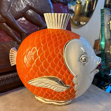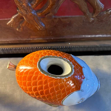 This mid-century Italian ceramic vase is a delightful mix of whimsy and sophistication, capturing the essence of mid-century design with its playful and elegant aesthetic. Made in Umbertide, Italy in the Pucci style of the 1950s, this vase features a vibrant colour palette dominated by shades of orange, gold and white. The ceramic body of the vase is expertly modelled in the shape of a stylised tropical fish, a motif often found in mid-century modern décor, symbolising prosperity and abundance. The orange and gold tones give the piece a warm and inviting glow, while the white accents add a touch of contrast and sophistication. The glaze applied to the ceramic surface gives the vase a brilliant sheen, enhancing its visual appeal and creating a sense of depth. The vase's distinctive fish-shaped silhouette makes it a striking focal point in any interior space. Displayed on the mantelpiece, coffee table or as a centrepiece, this Italian fish-shaped vase exudes charm and personality, infusing the room with a sense of retro chic, whether as a functional container for flower arrangements or as an eye-catching Objet d'art that adds character and style to any décor scheme.