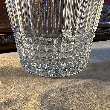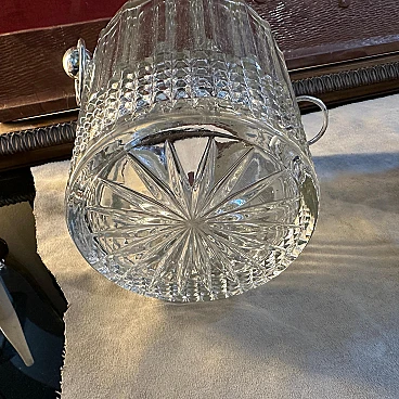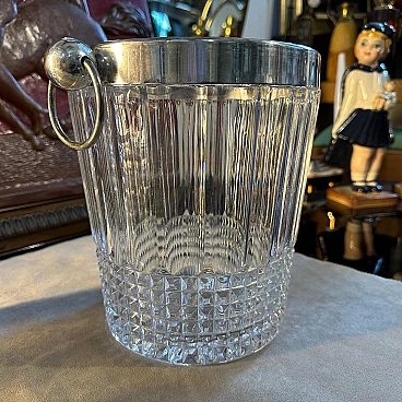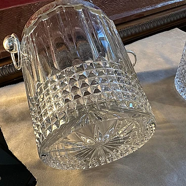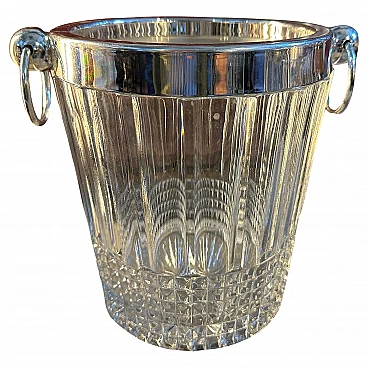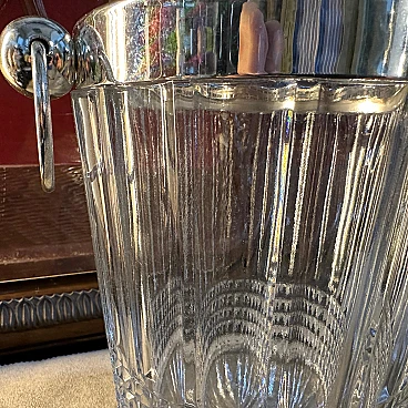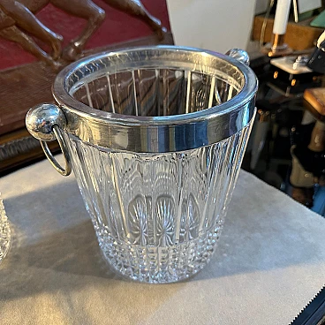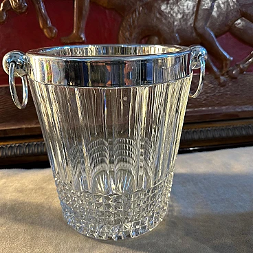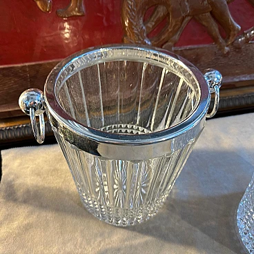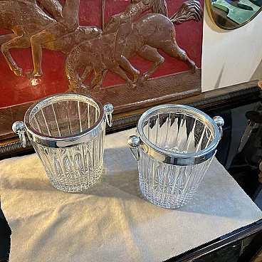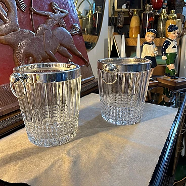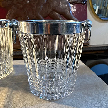 A pair of modernist wine coolers from the 1950s designed and manufactured in France, in high quality heavy crystal and silver plate, in perfect condition. They are the epitome of refinement and elegance and display a perfect blend of crystal and silver plates, marrying timeless materials with cutting-edge design. The crystal bodies of the wine coolers are meticulously cut and polished to impeccable clarity, allowing light to refract and dance within, creating a dazzling spectacle. The silver-plated frame adds a touch of luxury and these wine coolers exude opulence and sophistication. The sleek and elegant silhouette of the coolers is complemented by handles or knobs for easy handling and transport. These wine coolers not only serve as functional vessels for chilling and serving wine, but are also exquisite works of art that attract attention with their timeless beauty and understated charm. Whether displayed as centrepieces on a dining table or in a bar cabinet, these French wine coolers are sure to elevate any space with their unparalleled charm.