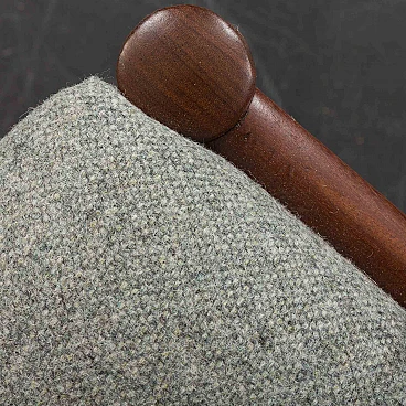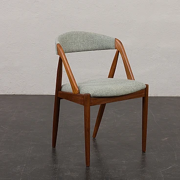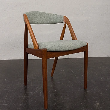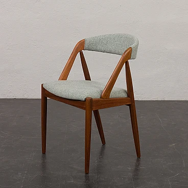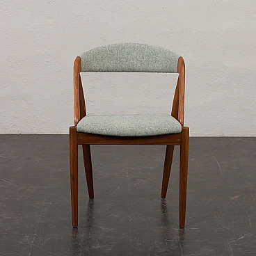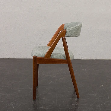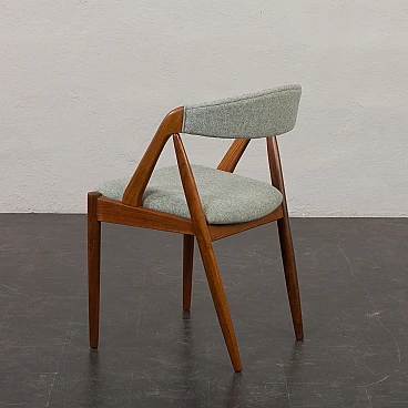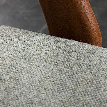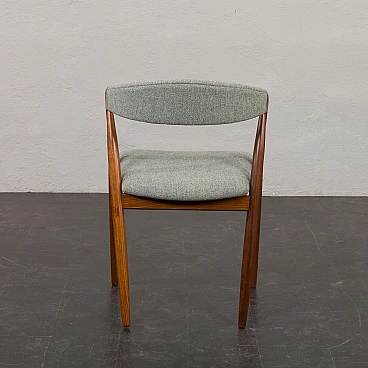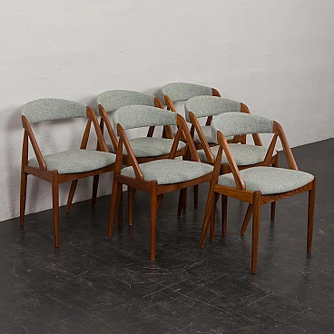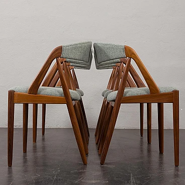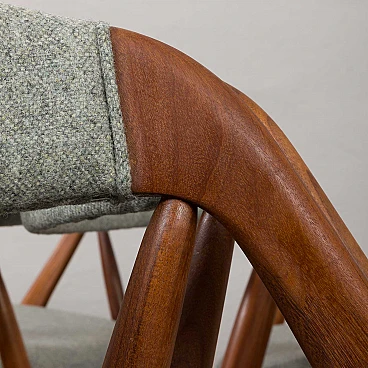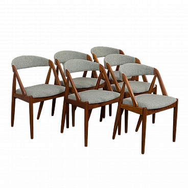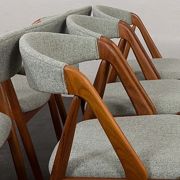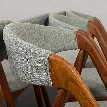 Set of six chairs mod. 31 by Kai Kristiansen for Schou Andersen (Denmark), 1960s. This teak chair set exemplifies mid-century Danish modernist craftsmanship. The ergonomic shape is complemented by the large seat cushion and sculpted backrests for added comfort. The structure is made of solid teak with beautifully exposed grain. The chairs were covered with light gray natural wool fabric. Thanks to the minimalist covering, these chairs will integrate perfectly into any interior; they will draw attention to the exquisitely sculpted structures, whilst retaining their unique character. Special care has been taken to ensure the finish and authenticity of these vintage pieces. The teak wood structures have been cleaned and treated with protective oil to enhance their grain. The new wool lining and new padding guarantee comfort and durability. Seat height: 45 cm.