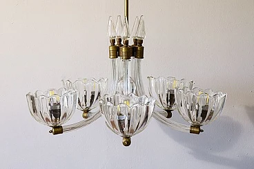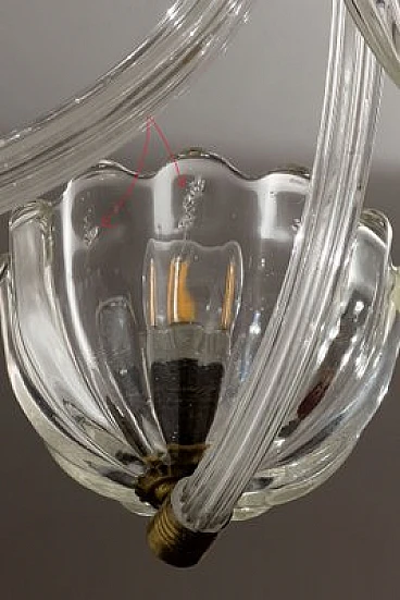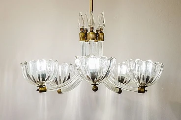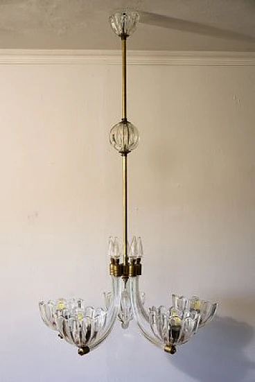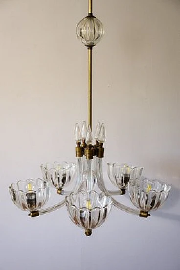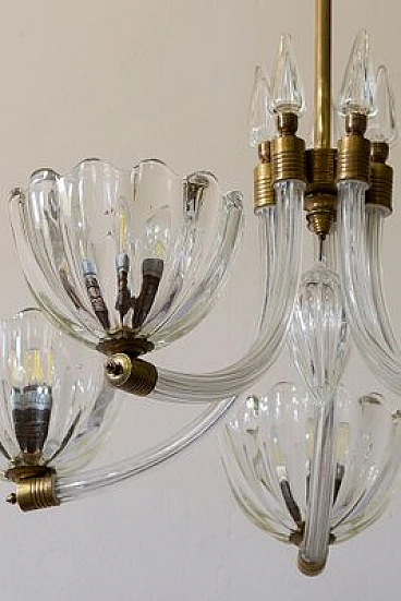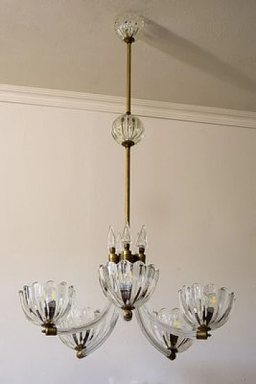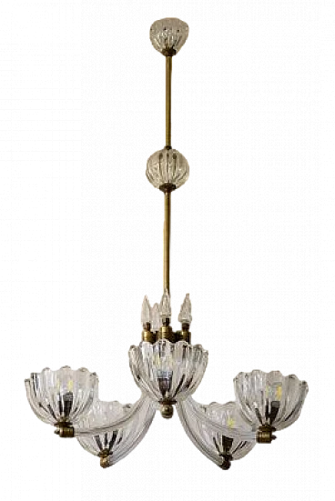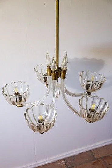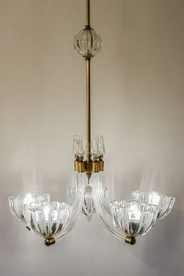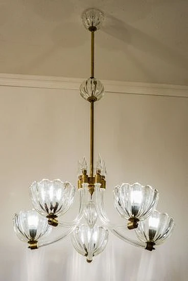 Murano glass pendant chandelier, Barovier & Toso, an authentic icon of Italian design from the 1940s, during the Art Deco period. The chandelier consists of five elegant bowls supported by glass arms adorned with brass details. Each arm ends in glass finials, creating a harmonious composition together with the central sphere and upper bowl. Each piece has been meticulously handcrafted by skilled Murano artisans. Thanks to its timeless design, this chandelier fits perfectly in a wide range of settings, both traditional and contemporary. Being an original vintage piece, it may show slight signs of time, which further contribute to its charm and authenticity. The chandelier is in excellent aesthetic and functional condition, with the glass flawless and intact. On request, I can shorten the height of the chandelier. The chandelier is in excellent aesthetic and functional condition, with the glass intact. However, one of the bowls has two small marks, which are the result of the hand-crafted construction process. It is plausible that during creation, when the cup was still hot, it may have been accidentally touched by an object that left these marks in the glass. These marks should be considered as an added value to the craftsmanship. They are visible in an enlarged photo.