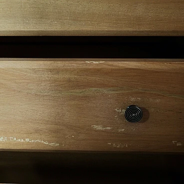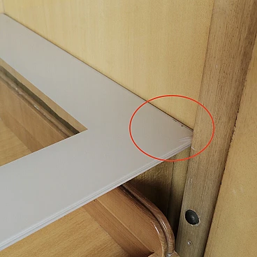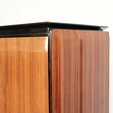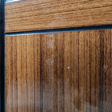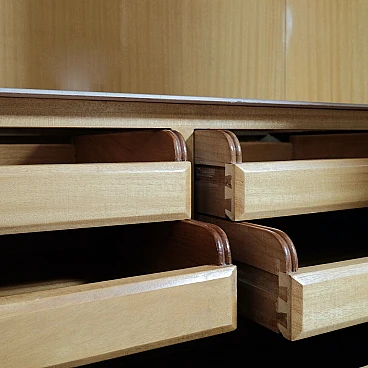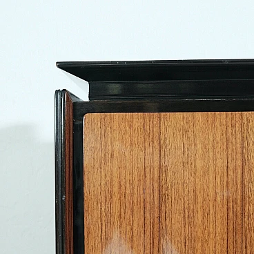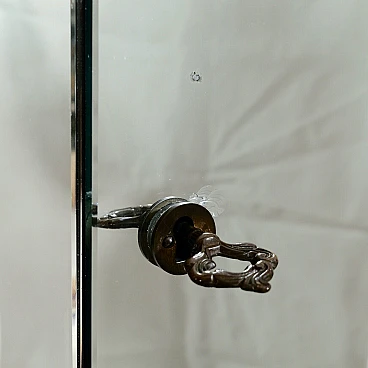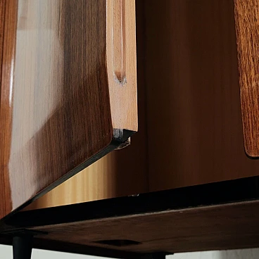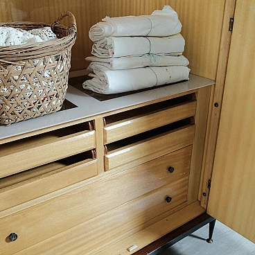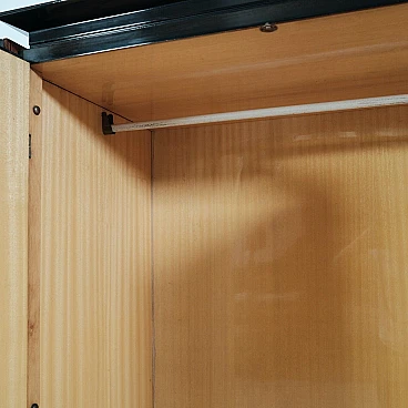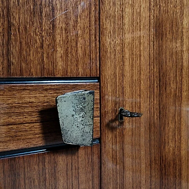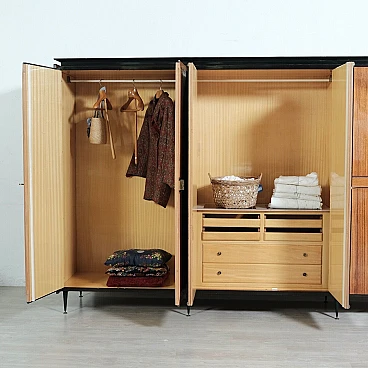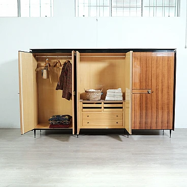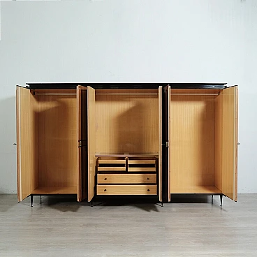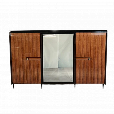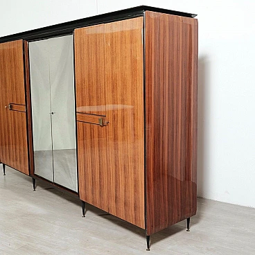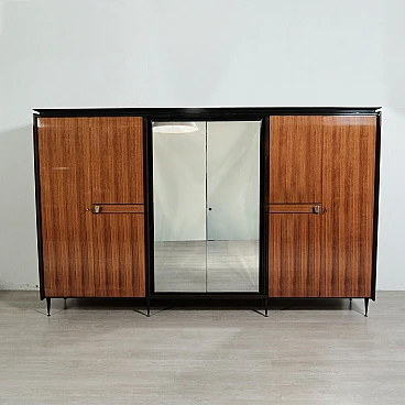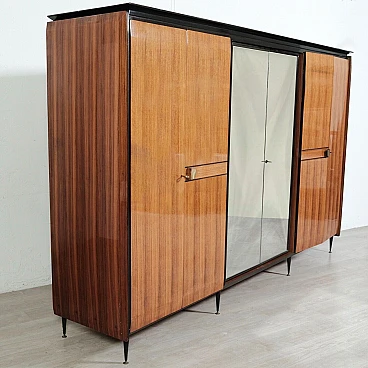 Six-door wooden wardrobe with mirror, circa 1950s-60s. Wooden structure, base with eight legs with brass feet to support and boost the wardrobe block. Six doors in total closing the three compartments. Four wooden doors and two central glass ones. One of the two glass doors has evident chips on the edge (see photos). Clothes rods in all three compartments. Three working locks with keys. Inside drawer unit included. Interesting horizontal design element at the brass handle. Height from the ground (feet): 18 cm. Used in good condition with normal signs of wear: slight crack at the corner of the internal glass above the chest of drawers; right glass door with chip at the key; evident chip along the lower edge of the glass (see photos).