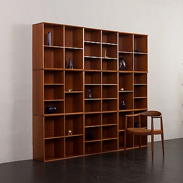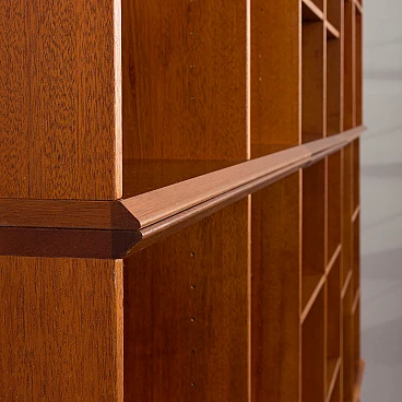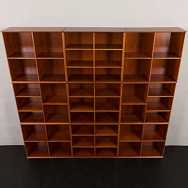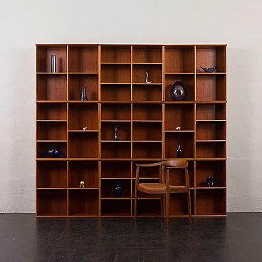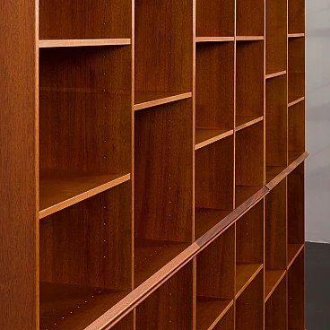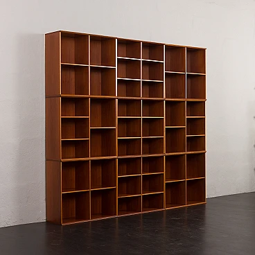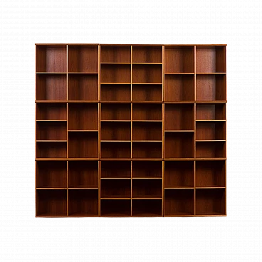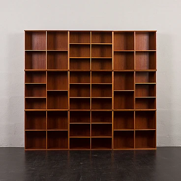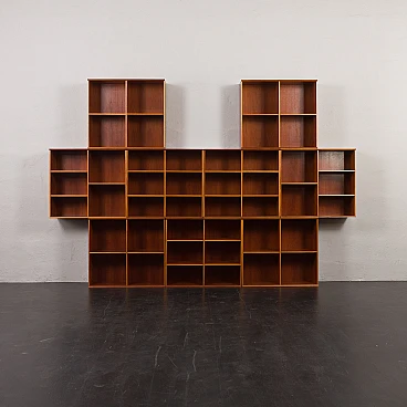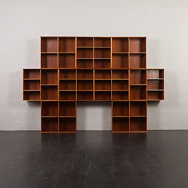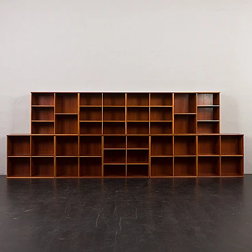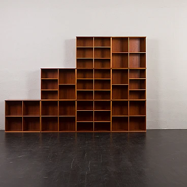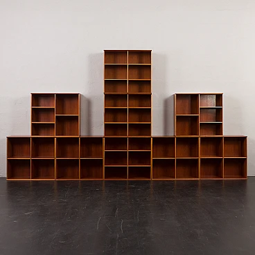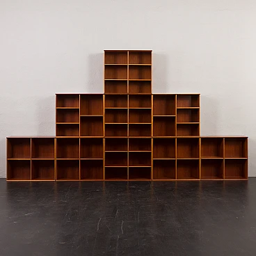 Danish modular bookcase in mahogany, 1970s. Strikingly reminiscent of Mogens Koch's famous and timeless design from 1928, the "MK Bookcase System". The Koch bookcase has been produced continuously for more than 80 years and this particular set most likely dates back to the 1970s. This particular bookcase, with its nine square modules and twenty-six shelves, offers almost infinite flexibility with countless elements. The basic module, the bookcase with its internal compartments, can be easily adapted to the size of the books by changing the height of the internal shelves. The design also allows individual units to be stacked or arranged in various configurations to suit different spaces and needs. This flexibility makes it suitable for rooms of various sizes and purposes. It's like playing Tetris in real life. Each bookcase unit is precision constructed from mahogany wood, featuring clean lines and careful joinery. The intense color and fine grain of the wood add charm and warmth to the minimalist, geometric shape. The wood has been cleaned and treated with protective oil to enhance its grain. All nine modules are in excellent vintage condition with minimal and normal signs of use and age. The single module is 72 cm high, 80 cm wide and 32 cm deep.