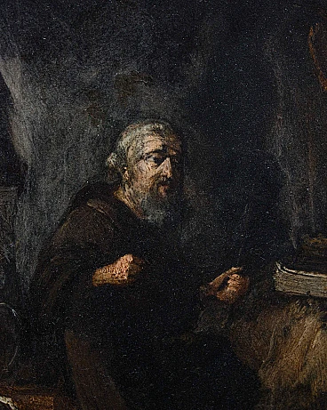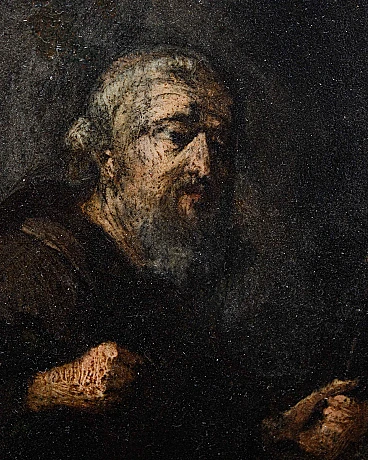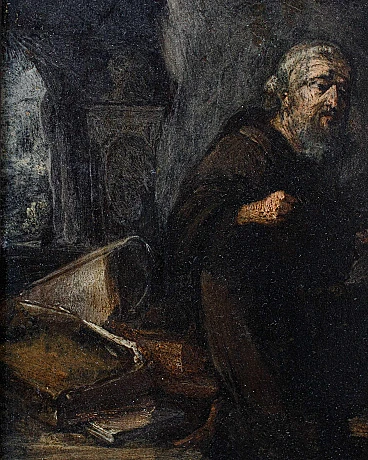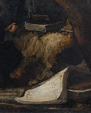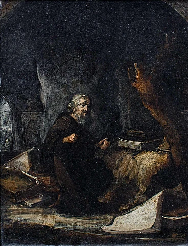Follower of David Teniers the Younger, 17th century, St. Anthony at Prayer, oil on copper, 38 x 30 cm, with frame 43 x 35 cm. From the end of the 16th century, the complex symbolism used by Bosch gave way to a proliferation of rather suggestive demons. Teniers also adapted, but stuck to a coherent iconographic code, e.g. the tools and pipe that the monsters carried were objects from everyday life, and could therefore be recognised by the seventeenth-century viewer. Its fame also favoured the proliferation of reinterpretations, such as the copper depicting the saint praying in his cave, where he spent the first 35 years of his hermitage. This version lacks the usual demonic creatures carrying jugs of wine, all allusions to the sensory pleasures of life. The main comparison can be made with the version of the saint signed by Teniers in a private collection, mirroring our own. It can be assumed that the Flemish artist who made this version based himself on one of the many engravings circulating in Flanders and northern Europe in general at the time. David Teniers the Younger (1610-1690) was the first of these masters to depict drinkers and smokers, card and dice players in an often humorous vein, drawing inspiration from everyday reality. Given the stylistic and thematic characteristics of the works examined, a realisation at the hand of a painter active in his circle can be identified. David Teniers the Younger was born in Antwerp in 1610. He received his first rudiments of painting from his father, before being influenced by the painting of his peer and friend Adriaen Brouwer (1605-1638), a painter of bright and vivid tones, attentive to detail and detail. In 1632 he was enrolled in the Guild of St. Luke. His pictures of Flemish folk life, influenced by his friend Brouwer, enjoyed considerable success and were also collected by the aristocratic classes and the ruling houses themselves.
