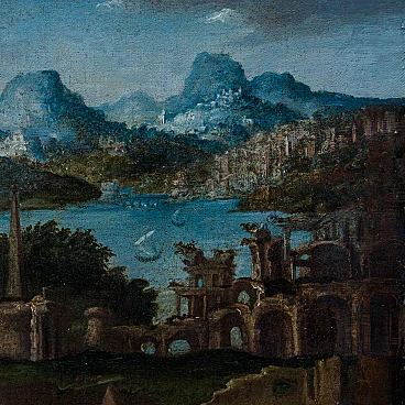 Mannerist painter, 16th century, Leda and the Swan, oil on canvas, 87.5 x 142 cm. Initial ‘P’ in the centre of a cushion embroidery Leda, Queen of Sparta and bride of Tindarus, is lying on a sheet with her torso raised by a white cushion. Her figure, which occupies the entire space of the canvas, is softly joined by that of Zeus in the guise of a swan. Following this union, according to the myth, Leda laid an egg from which Helen, Pollux, Castor and Clytemnestra were born. The story is supposed to have taken place along the river Eurota, but the backdrop in the present painting is a detailed view of a mountain range surrounding a lake, and some buildings. An aqueduct and the Cestia Pyramid stand out among them: a landscape piece of great quality, in essence, especially in the chromatic rendering of the surrounding vegetation and the softly outlined mountains, so much so that one might think the artist had studied the works of the master Leonardo. The voluminousness of the female figure is reminiscent of mannerist stylistic elements, and it is therefore possible to circumscribe its chronological realisation to the middle of the 16th century. For the origins of the iconography of the reclining Leda, in antiquity preferred in the standing variant, it is necessary to dwell on an engraving by Albrecht Dürer (1471-1528), depicting the woman in the company, instead of the swan, of a sea creature. Cesare Reverdino (second half of the 16th century) took up this work again, this time placing Zeus in a changed form alongside the queen. It is Michelangelo's lost version, however, that has inspired the greatest number of replicas: painted on commission by Alfonso I d'Este, Duke of Ferrara, the canvas imposed itself as an open challenge to his colleague Titian, who had just delivered three paintings to the duke. Michelangelo completed the work, said by biographer Condivi to be of considerable size, by 1530 or the following year; it would seem that, in response, Titian immortalised the famous Danae now in the collection of the Museo e Real Bosco di Capodimonte, which Michelangelo saw when in Rome but criticised, in 1545. Following an argument with the duke's representative, the Tuscan artist gave the canvas and preparatory cartoon to his pupil Antonio Mini, who took both to France to sell them to François I. Although tradition has it that it was the superintendent of Fontainebleau, Des Noyers, who burnt the original painting for indecency, there is still no record of its disappearance. We do know, however, that Cornelis Bos made an engraved copy and that Michelangelo himself made a study for Leda's face in red plaster, which is now kept at Casa Buonarroti in Florence. The oldest replica of the master's canvas to date is the painting exhibited at the National Gallery in London, although the Dioscuri mentioned by Cornelis does not appear in it. Long attributed to Rosso Fiorentino due to the testimony of Cassiano del Pozzo, who saw a similar one in the Fontainebleau picture gallery in 1625, and also because of the cartoon that Vasari records as being in the artist's studio at the time of his death in 1540 (London, Royal Academy of Arts), the canvas has now been more prudently attributed to an anonymous hand. The variant of the reclining Leda, also recurring in a sculpture by Bartolomeo Ammanati (Florence, Museo Nazionale del Bargello), was joined by Leonardo da Vinci in the form of a kneeling queen near a reed bed (Study for Leda, Rotterdam, Boymans-van Beuningen Museum and Chatsworth House, Derbyshire), soon taken up by a large number of his pupils, including Cesare da Sesto (Rome, Galleria Borghese) and Francesco Melzi (Florence, Uffizi Galleries). Raphael later replicated a Leonardesque study by proposing a standing Leda (Windsor, Royal Collection). The object is in good condition.