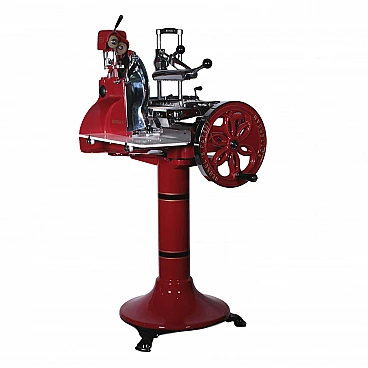 Berkel slicer model 9H in chrome-plated iron and red patina with steel, aluminium and bakelite elements. Teflon worktops. Original mechanism with flower flywheel replaced. Base not contemporary, reproduced from the original. Manufactured in its original state. The object has no defects and has not been restored.