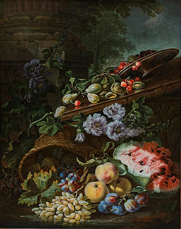 Maximilian Pfeiler (active from 1683-c.1721) .Still life of flowers and fruits. Oil on canvas, 98 x 73 cm. Maximilian Pfeiler's life is not well documented and there are few chronological references about his activities. The few existing sources tell us that in 1683 he was a member of the Guild of Painters in Prague, his hometown, and a pupil of Christian Berentz (1658-1722), a painter of German descent who traveled first to the Netherlands and then settled in Rome, introducing northern European themes of the still life genre in which he specialized to Italy. It is unclear whether Pfeiler's alumnuship at Berentz already took place in Rome, where the Czech artist was certainly active by 1694 weaving collaborations with Francesco Trevisani and Michele Rocca. Pfeiler thus succeeded in carving out a prominent role for himself in the Roman art scene of the late 17th-early 18th century, producing extravagant and recognizable compositions of fruits and flowers that were highly prized by distinguished men: for example, some of his works were part of Cardinal Fesch's collection.