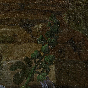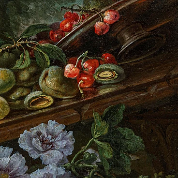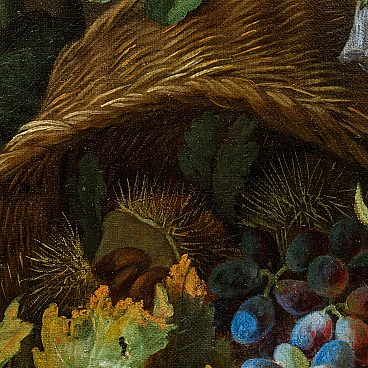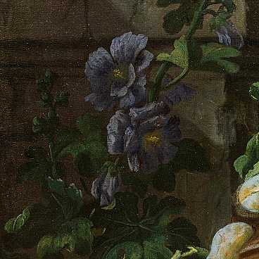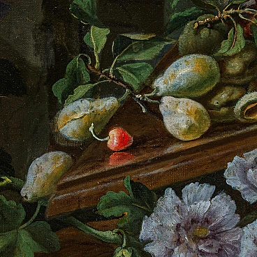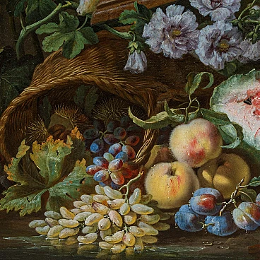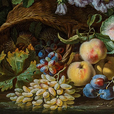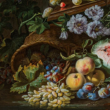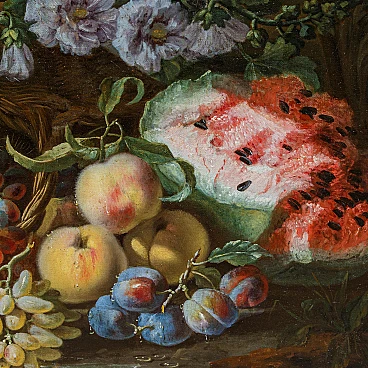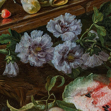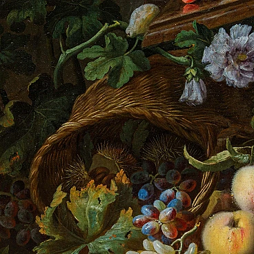 As already in Tamm's or Vogelaer's compositions the backdrop for the flowers and fruits is an architectural fragment, already introducing the taste for ancient ruins that would be fully consolidated in the 18th century. The various types of fruits are arranged by overlapping groups that stack on top of each other following diagonal trends. Starting from the bottom we see a cluster of white grapes along with peaches, plums, and half a watermelon. Slightly further back is an upturned wicker basket within which are some chestnuts still in their husks and partially covered by large green leaves mottled with orange. Flowers with lilac petals, the same ones that wrap around the base of the column in the background, bisect the canvas.
