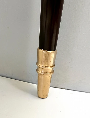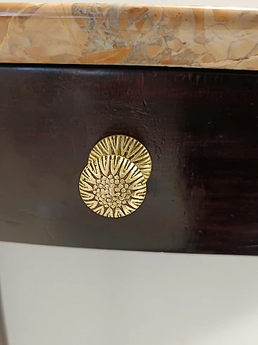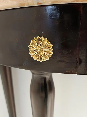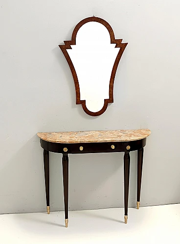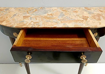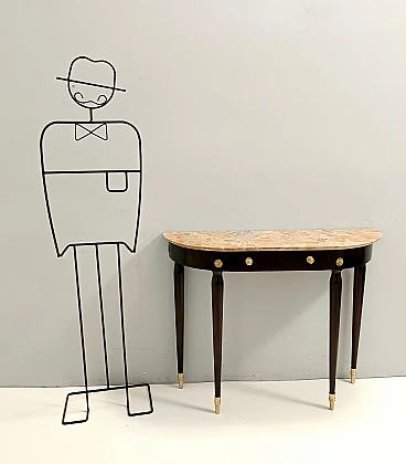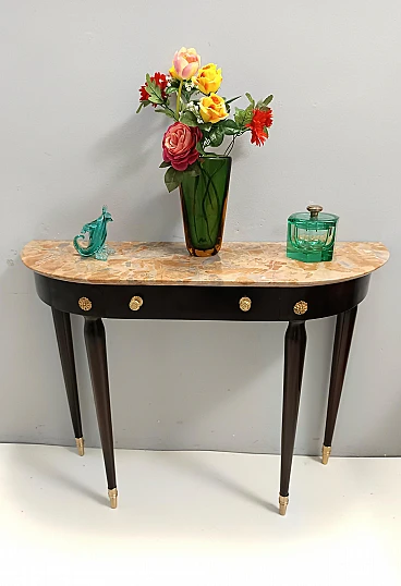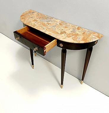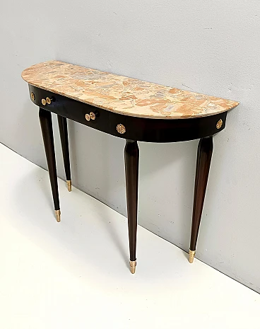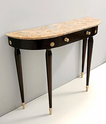 Made in Italy, 1940s - 1950s. It features an ebonized beech frame with brass feet caps and details and a demilune Macchiavecchia marble top. This console may show slight traces of use since it's vintage,