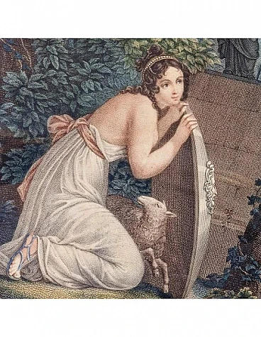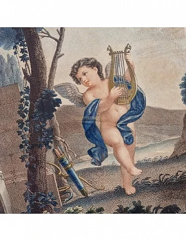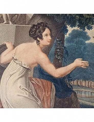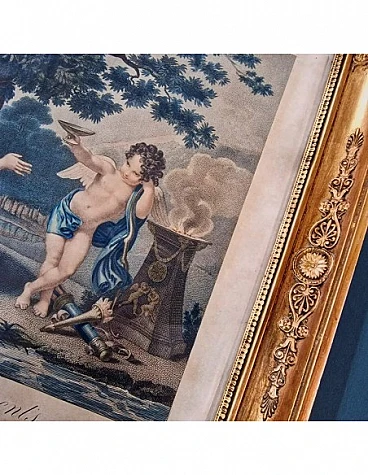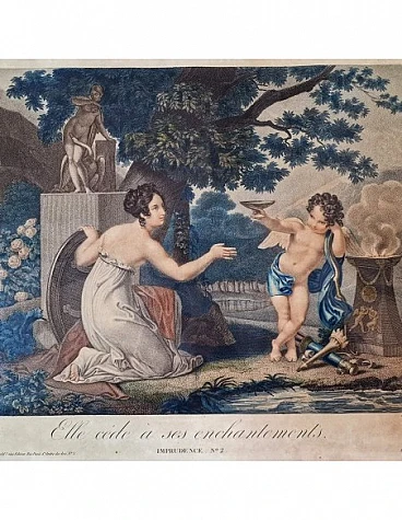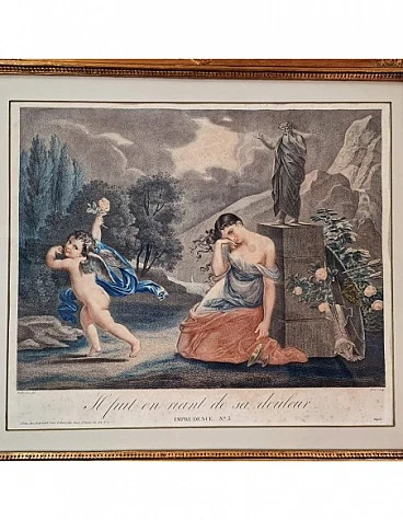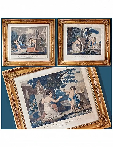 Group of three engravings "The Imprudences of Cupid", early 19th century. Engravings in the dotted manner (etching) printed with colored inks (coloured in plate). Subjects: Elle commences à l'écouter; Elle céde à ses enchantements di lei; Il fuit en riant de sa pain of her. Engraver: Jean-François Prot, French engraver active towards the end of the 18th century. From the subject of Ludwig Rullmann (1765 - 1822). In beautiful 19th century Empire gilt frames. The prints are accompanied by the certificate of authenticity.