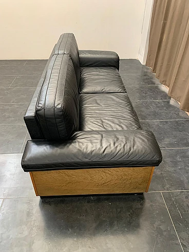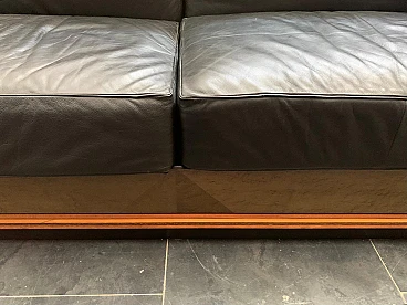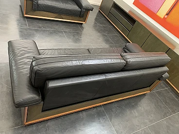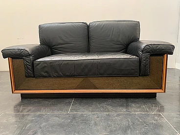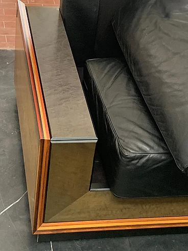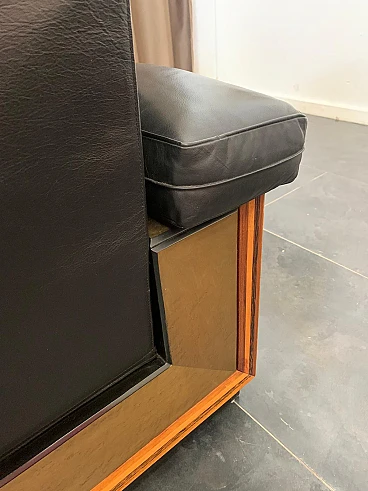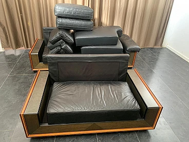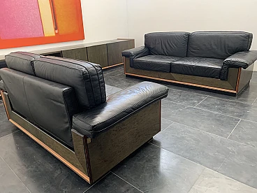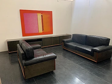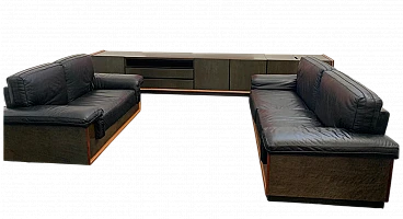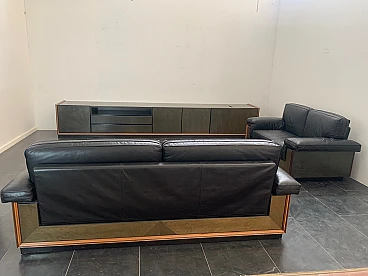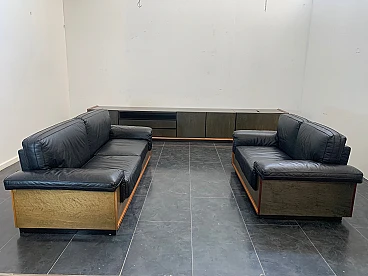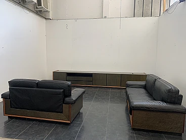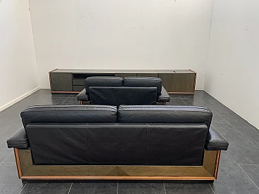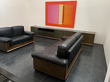 The room is completed with a sofa and from 3 persons one is from 2 finished all round. In the group, a frame composed of 5 wooden slats of various woods stands out, which closes sloping over the body of the furniture outlining the lower and side profiles. In the centre and above the outlining profiles are ebonised. The centre and interior bodies of the sideboard are in bottle-green tuja burl. The overall ambience is classy, certainly exclusive and unique. The effect is harmonious and relaxing. Excellent condition, one side of a sofa is lighter due to the presence of direct light over time, it is uniform and not disturbing and the drop in tone is hardly noticeable. Manufacturer's label and certificate of provenance present. Sideboard: 400x64x64 cm; three-seater sofa: H 88x230x90 cm; two-seater sofa - H 88x170x90 cm. May show minimal traces of use.
