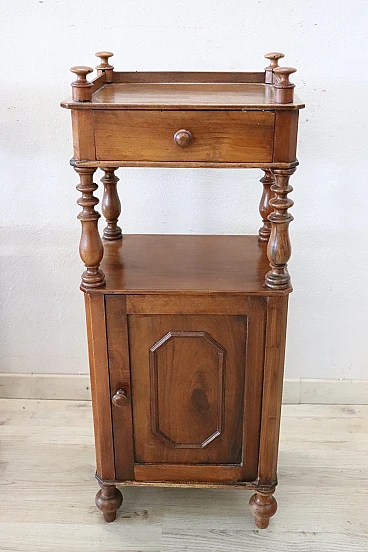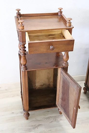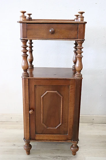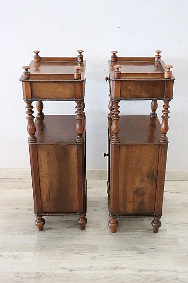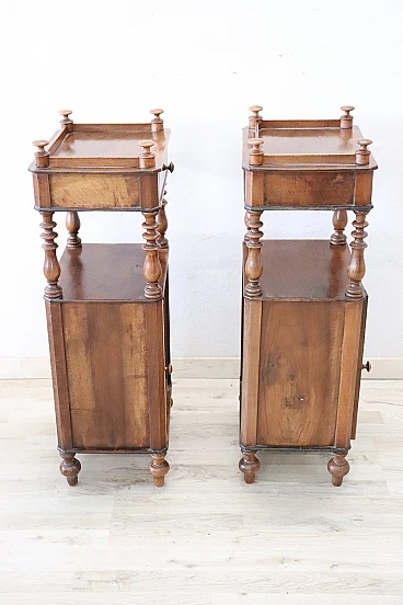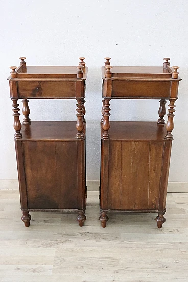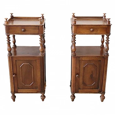 Antique bedside walnut tables, Louis Philippe era, 19th century. Pair of antique bedside tables, Italy mid-19th century, Louis Philippe era, in solid walnut. Characterised by a particular line enriched by turned columns. Fitted on the front with a small drawer and a door with ample storage space. Possible small signs of wear in the finish. Price negotiable, please send us your purchase proposals, we will evaluate them with pleasure. We advise you to take a good look at all the pictures in detail.