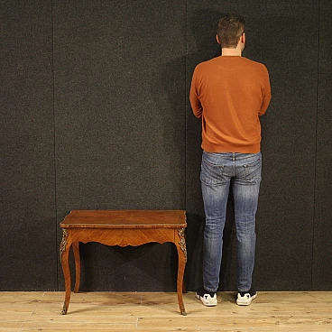 French XV Louis XV style table. Bois de rose woods, maple and fruit woods, of great elegance. Low table ideal for a living room but easily insertable in different points of the house. Table supported by four solid legs moved adorned with splendid chiseled and golden bronze decorations. Mobile equipped with a drawer of good capacity (see photo). Plan in an excellent service character with small border also in chiseled bronze. It has some small signs of the time (see photo), overall in good conservative state.