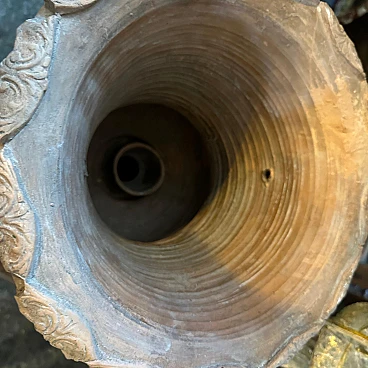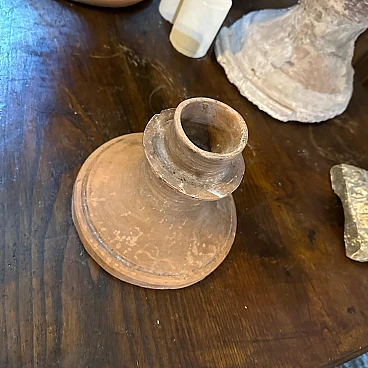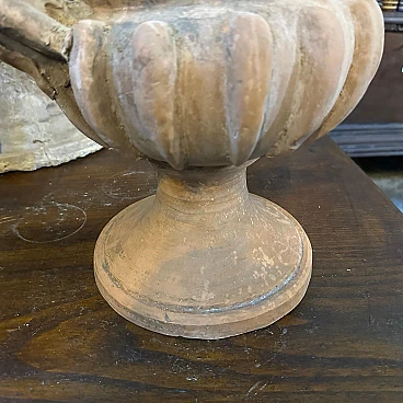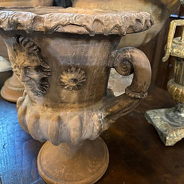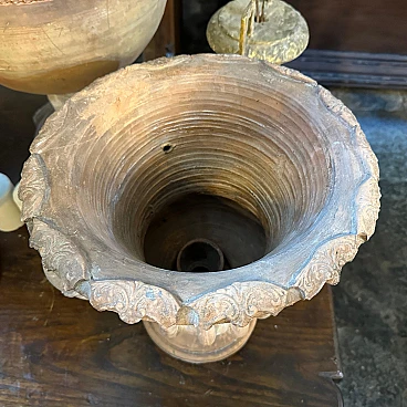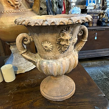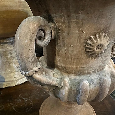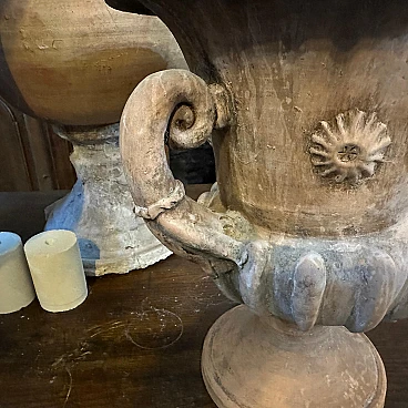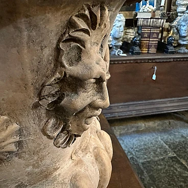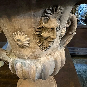 An amazing crater vase hand-crafted in Grottaglie, small town in Puglia famous for high quality ceramics. It's in original condition with normal signs of use and age, it's composed by two pieces how you can see in the pics. This vase is a stunning artifact, blending the classical influences of ancient Greece and Rome with the refined craftsmanship of early 20th-century Italy. Terracotta has a rich, earthy color, ranging from deep red to a warm, sandy hue. The terracotta's natural texture is smooth yet slightly porous, indicative of hand-crafted pottery techniques.T he surface of the vase is adorned with intricate reliefs meticulously crafted, with fine details emphasizing the Neo-Classical style’s admiration for ancient art.
