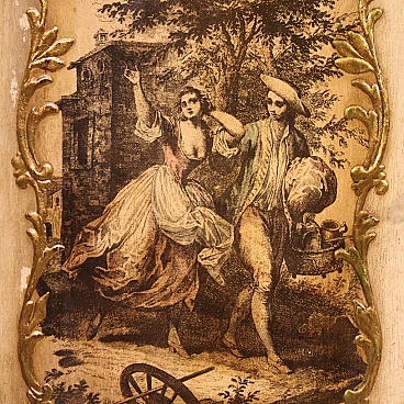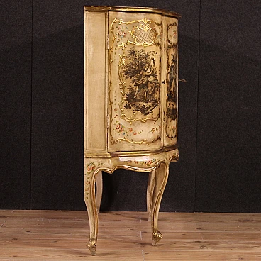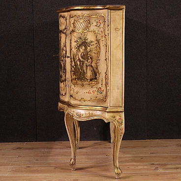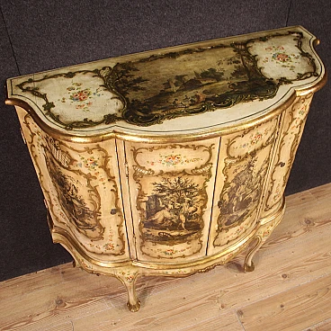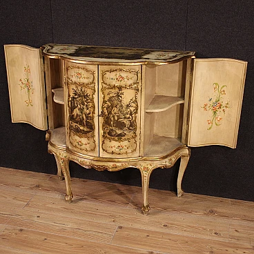 Venetian sideboard in Rococo style from the 20th century. Wooden cabinet carved, gilded and painted with fabulous floral motifs. It has four carvings with gallant scenes applied to the individual doors and a fifth on the upper shelf (see photo). Sideboard with two central doors with glass shelves and two side doors with interior shelves, good service. A piece of furniture of excellent proportions, ideal for inclusion in a living room or study, supported by four solid legs. Sideboard fitted with a working key (central doors). Structurally sound, overall in good condition, with some signs of time.