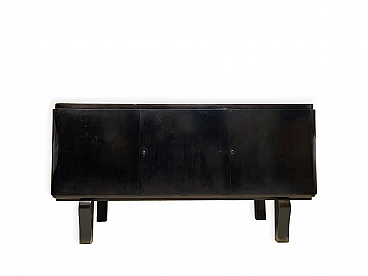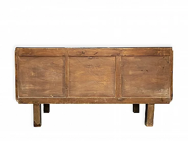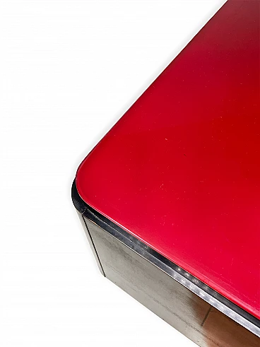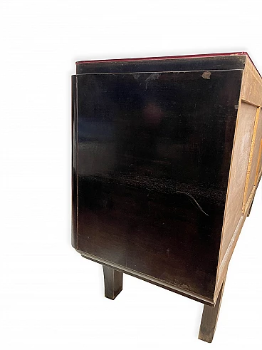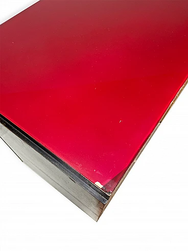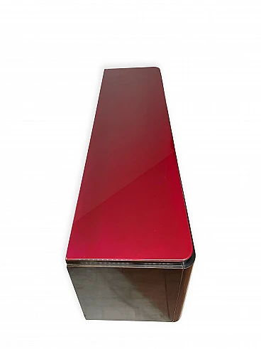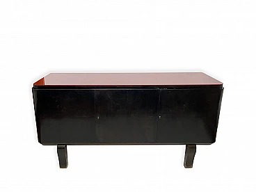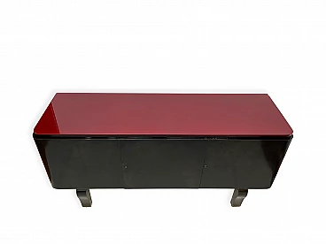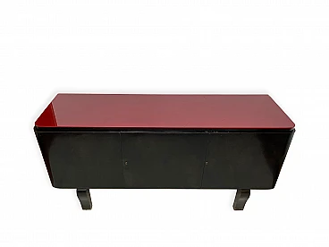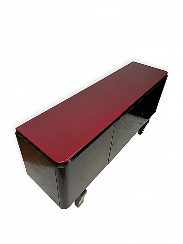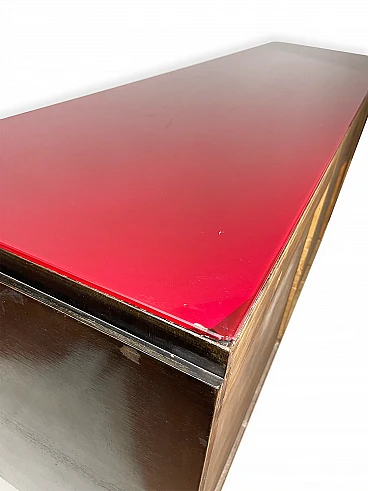 Italian sideboard, 1950s. The structure is made of solid wood and mahogany. The top is made of beautiful red glass finished with a technique typical of the period. The patina is glossy and super splendid. There is a cabinet with two hinged doors with two large shelves and a cabinet with hinged doors with three drawers and a wooden shelf. Two keys are included, to be used only for opening and not for locking. Good original vintage condition, despite some scratches and some minor defects on the glass top, consistent with age and use, as can be seen in the photos. Width 186 cm x height 93 cm x depth 51 cm. Made in Rome, Italy in the 1950s.