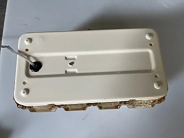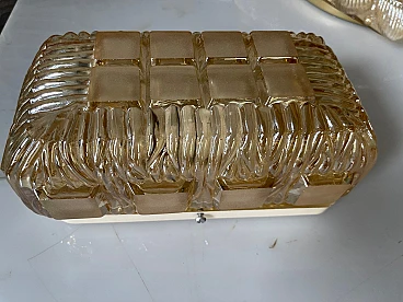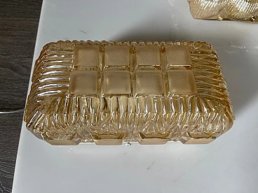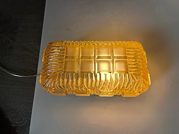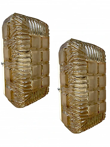 Pair of Murano glass wall sconces by Staff, Germany 1970s. Classic style, 1970s design. This piece was designed in the style of the selected designer and/or manufacturer. Width: 23 cm, depth: 12 cm, height: 12 cm. Equipped with one light each, requires E27 bulbs. New wiring installed, compatible with EU and UK electrical systems. This pair of Murano glass wall sconces features a unique, rectangular design with an intricate texture and warm amber hue. Each wall light is designed to accommodate a single E27 bulb, providing a beautiful glow that enhances any interior space. At 23 cm wide, 12 cm deep and 12 cm high, these wall lights are ideal for adding a touch of vintage elegance to hallways, living rooms or bedrooms. New wiring ensures safe and reliable use, making these vintage pieces suitable for modern homes. These wall lights are perfect for those who appreciate the timeless beauty and craftsmanship of Murano glass, offering both functionality and a classic aesthetic. Good condition, weight under 40 kg. This vintage/antique object may show some signs of wear such as scratches and other signs of time. Details of restoration and damage - Electrical components rewired and/or new. Is this piece functional? Yes, I had the piece rewired by a professional electrician. Price per pair, eight pairs available.
