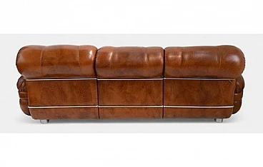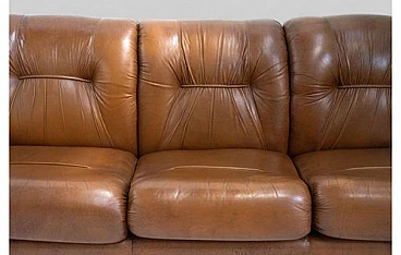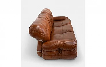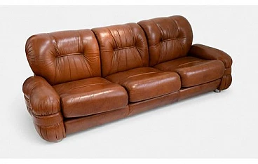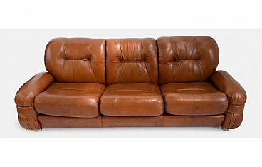 This elegant three seater sofa is an authentic piece of Italian design from the Midcentury Modern period, dating back to the 1970s. Featuring a distinctive silhouette and clean lines, this sofa embodies the timeless elegance and functionality that distinguishes the style of the era. The rich and inviting caramel brown leather is expertly quilted, offering a welcoming texture and unrivaled comfort.