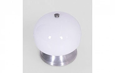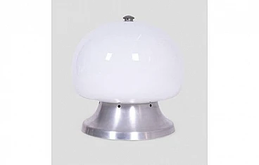 This table lamp is an authentic tribute to the design of the 70s. With its mirror-polished silver metal base and white opaque glass dome, it embodies the minimalist and functional style typical of that period. The rounded shape and clean lines of the lamp come together to create a lighting piece that not only serves its practical purpose but also acts as a sophisticated style statement.