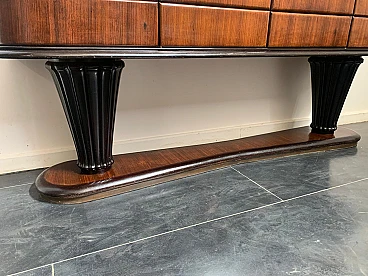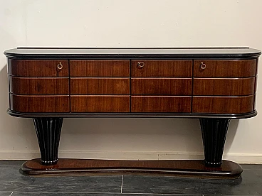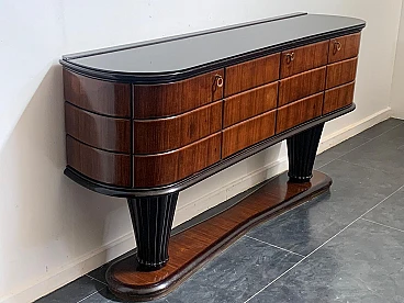 Sideboard attributed to Vittorio Dassi. The elegantly ovalised base narrows towards the profiled centre and is outlined above by ebonizing, below by brass slats. The base accommodates two vase-shaped columns carved in a thousand rows and ebonised, which support the body of the cabinet. The sideboard is sinuous with its curved sides and rounded ashlars. Masterfully crafted in solid wood and veneered in rosewood. It has four doors, with a bar compartment in the centre with a glass back decorated in silver. The top is black glass.